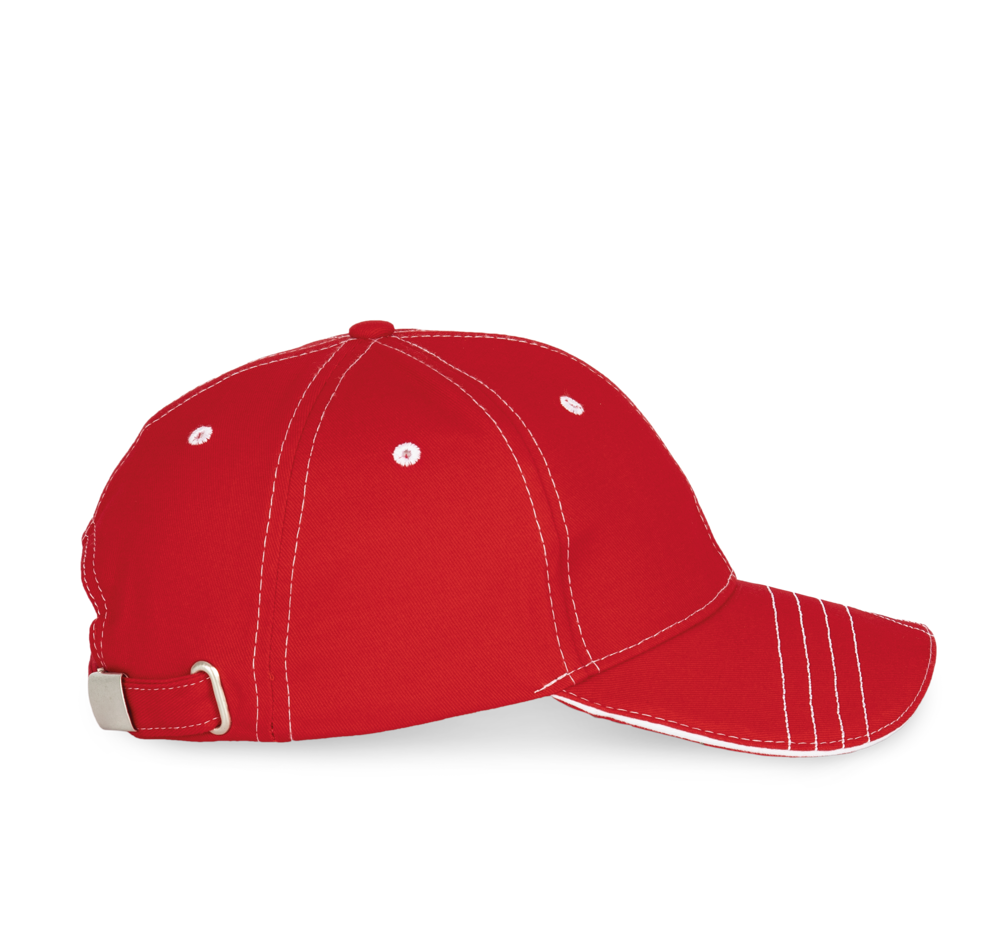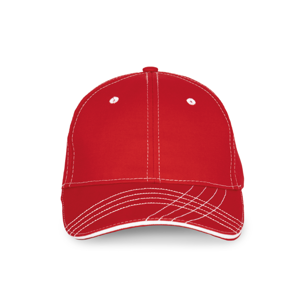 100% Cotone Twill. Cappellino 6 pannelli laminati. Occhielli e cuciture con colore in contrasto. Fascia anti-sudore in cotone.