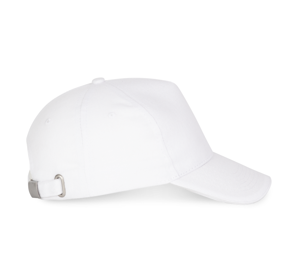 100% Cotone Twill pettinato. Cappellino 5 pannelli laminati. Fascia anti-sudore in cotone. Chiusura regolabile con fibbia in metallo.