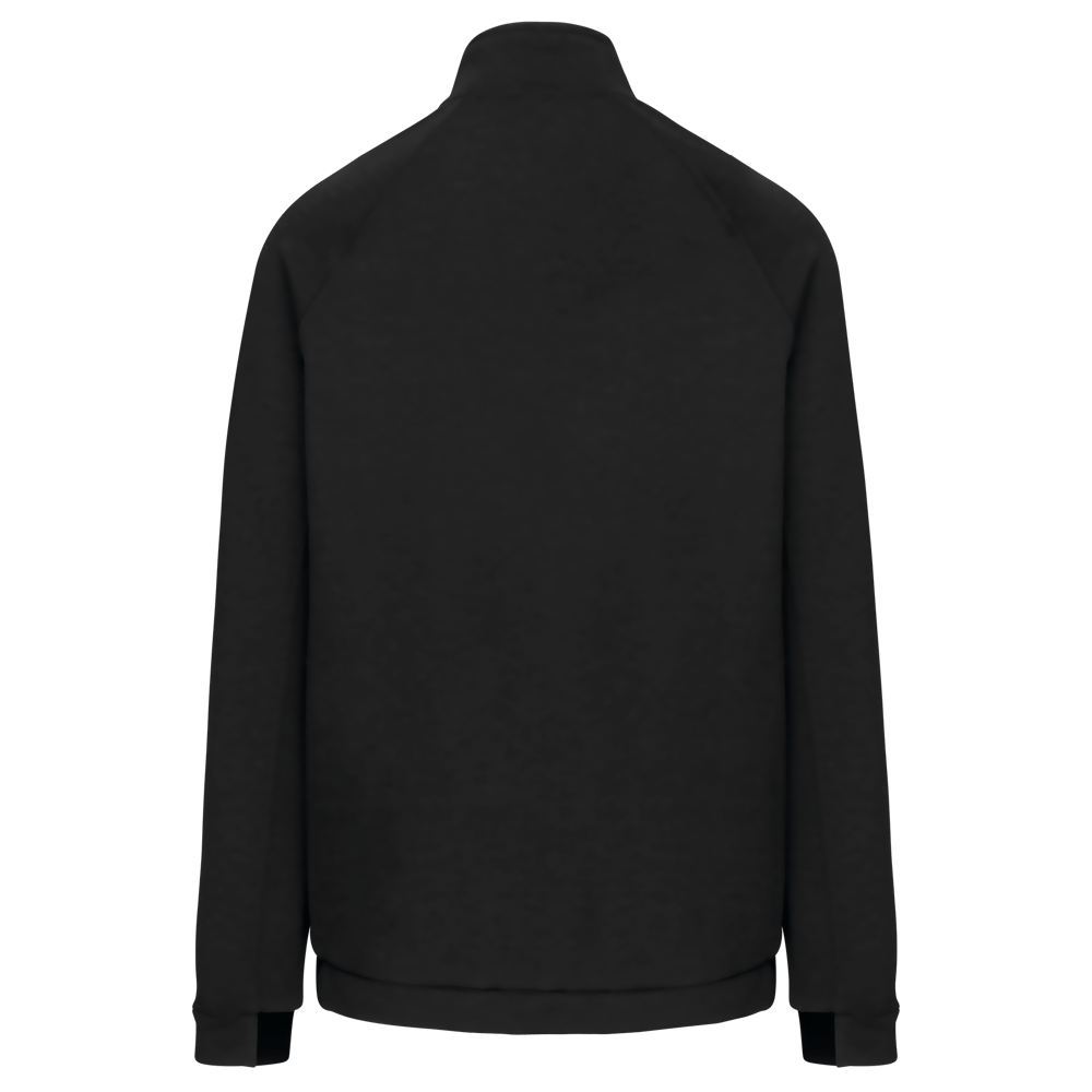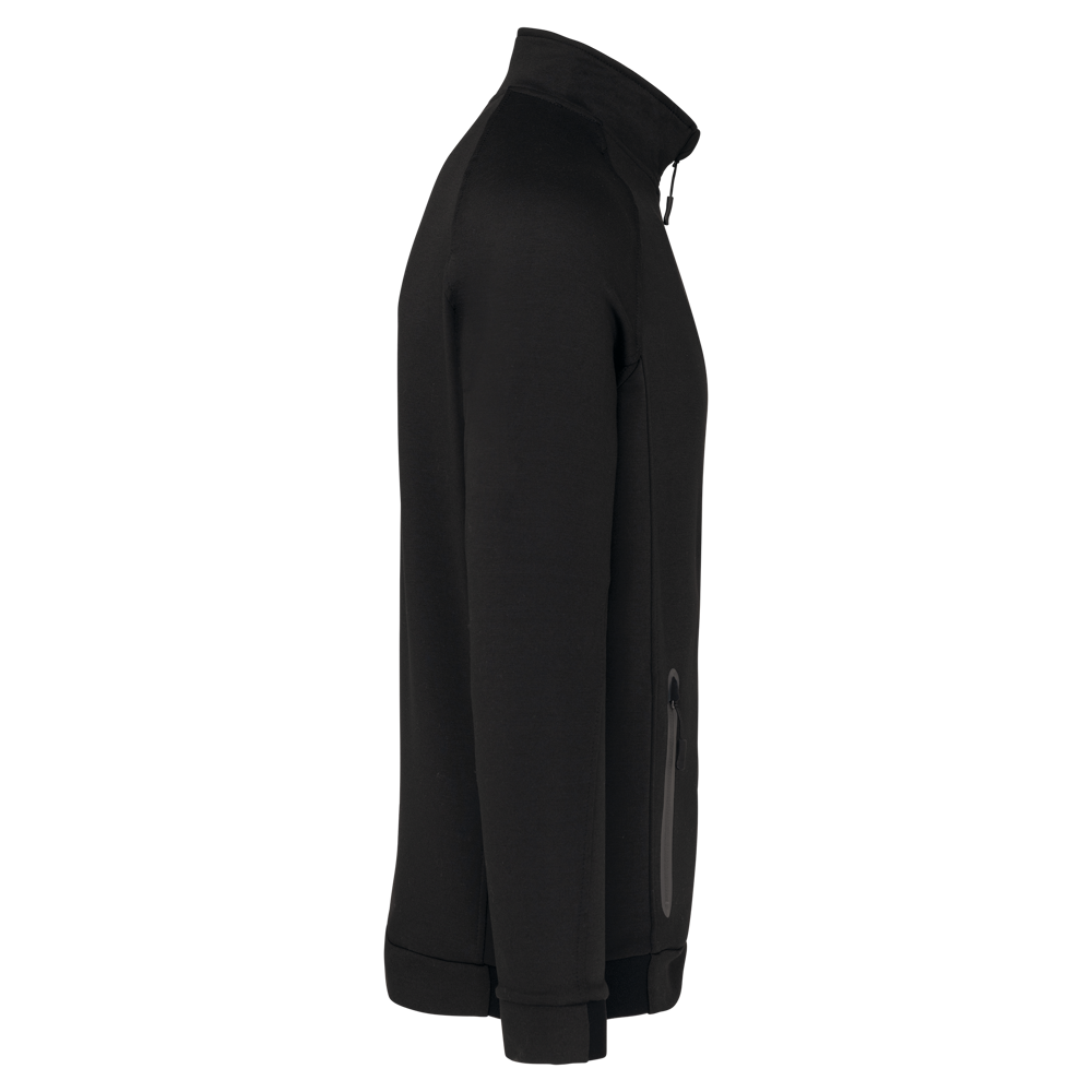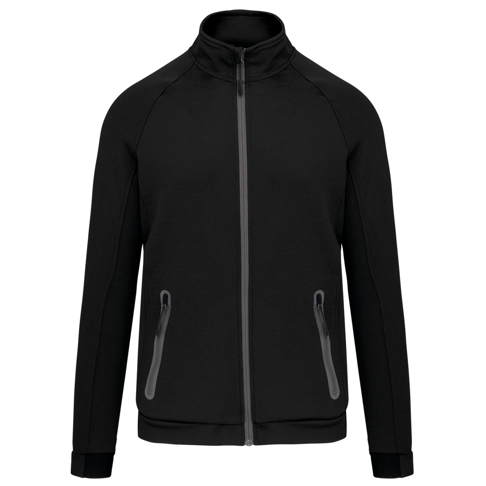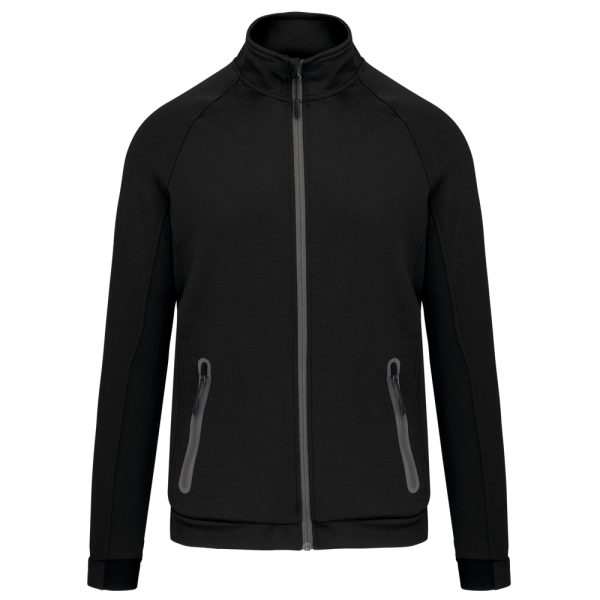 94% poliestere / 6% elastan (79% poliestere / 15% viscosa / 6% elastan per il colore melange). Materiale ultra comodo. Chiusura con zip. 2 tasche con zip sul davanti e finitura termosaldata. Fondo manica e fondo capo stretti con una parte elasticizzata Black su tutti i colori e Dark Grey sull'erica di Ash Heather (anche le chiusure). Ideale da indossare con i pantaloni tuta PA1008 per uno stile totalmente "urban apparel".