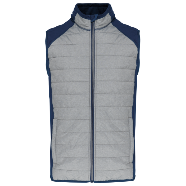 Esterno: corpo 100% poliammide ripstop con trattamento idrorepellente, lati e retro 90% poliestere / 10% elastan. (Marl grey/ Sporty navy: 100% polyester). Imbottitura interna 100% poliestere. Materiale ultra comodo. 2 tasche con zip sul davanti. Chiusura con zip a contrasto. Giromanica e fondo capo con sbieco elastico. 1 zip lato cuore per apertura e personalizzazione.