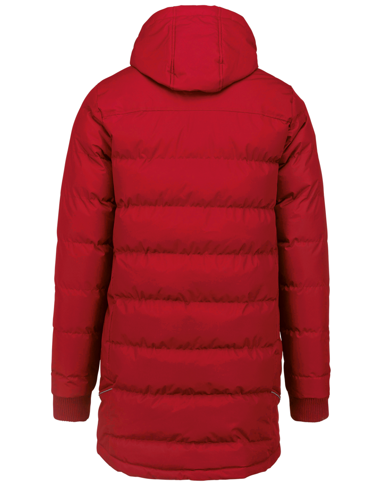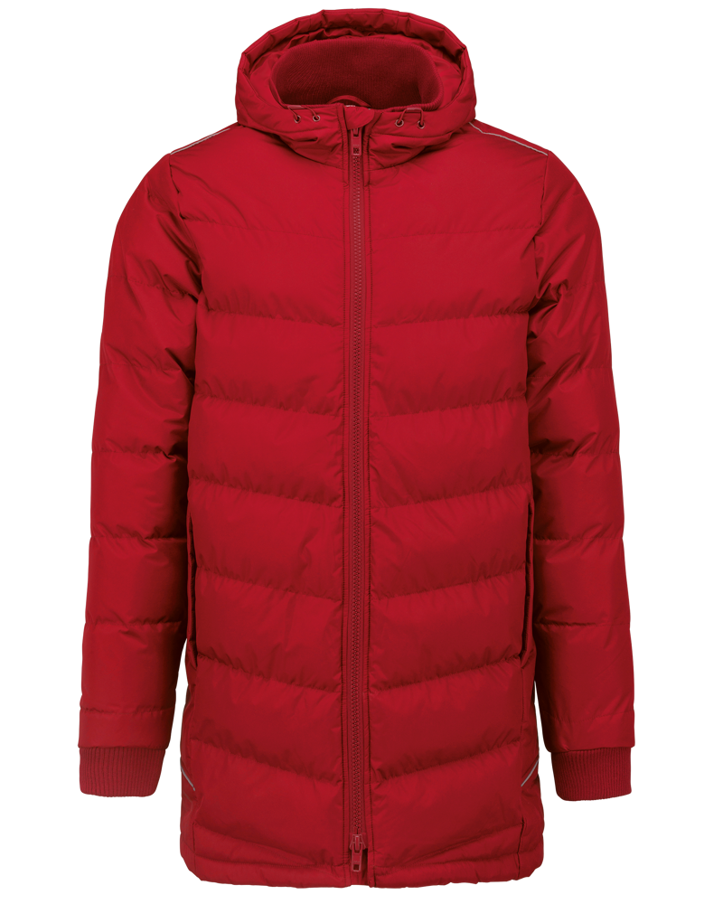 Esterno: 100% poliestere 200 g/m² con spalmatura in PVC (trattamento idrorepellente). Imbottitura interna 100% poliestere 350 g/m². Fodera 100% poliestere 60 g/m². 2 tasche laterali con zip. 1 tasca interna. Colletto e fondo manica a costine. Sbieco riflettente su spalle e lati. Cappuccio foderato. 1 zip lato cuore e 1 zip a fondo capo per apertura e personalizzazione.