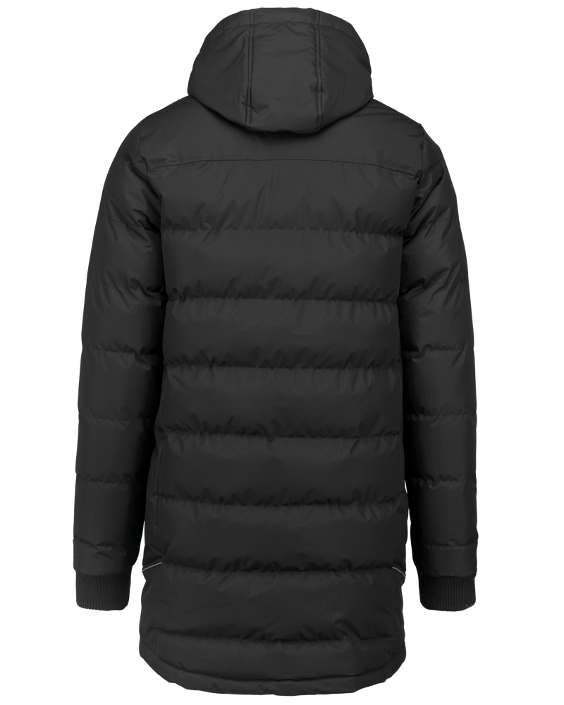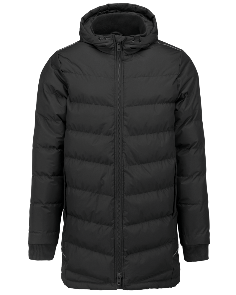Esterno: 100% poliestere 200 g/m² con spalmatura in PVC (trattamento idrorepellente). Imbottitura interna 100% poliestere 350 g/m². Fodera 100% poliestere 60 g/m². 2 tasche laterali con zip. 1 tasca interna. Colletto e fondo manica a costine. Sbieco riflettente su spalle e lati. Cappuccio foderato. 1 zip lato cuore e 1 zip a fondo capo per apertura e personalizzazione.