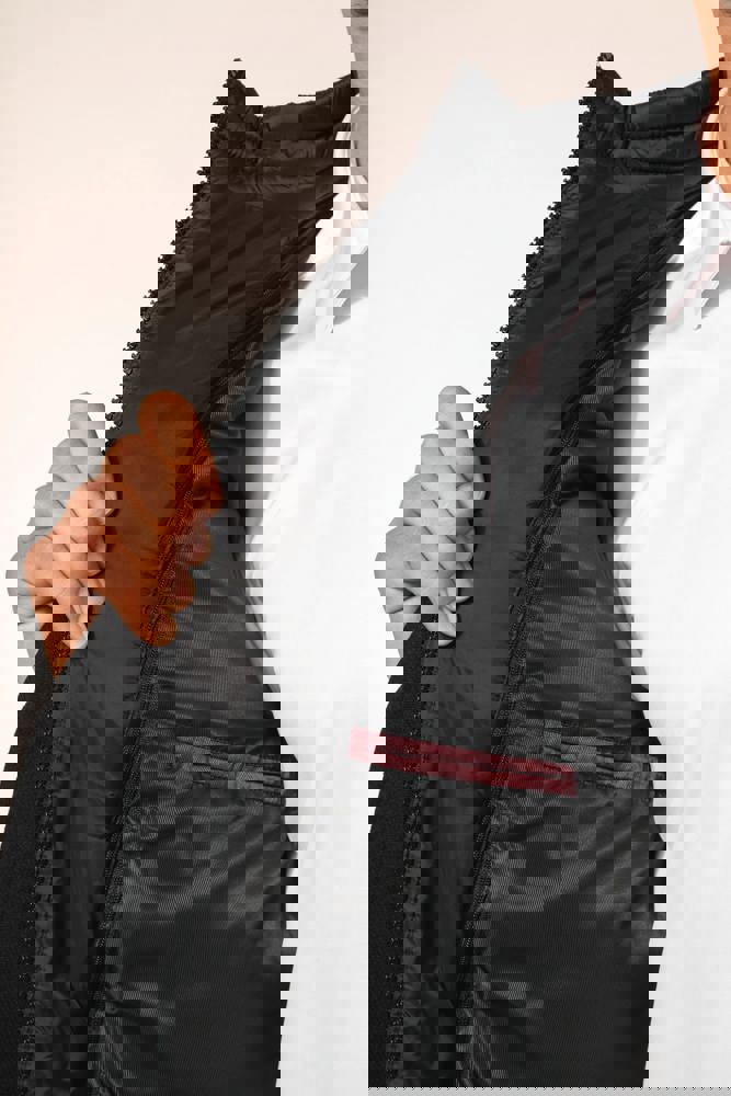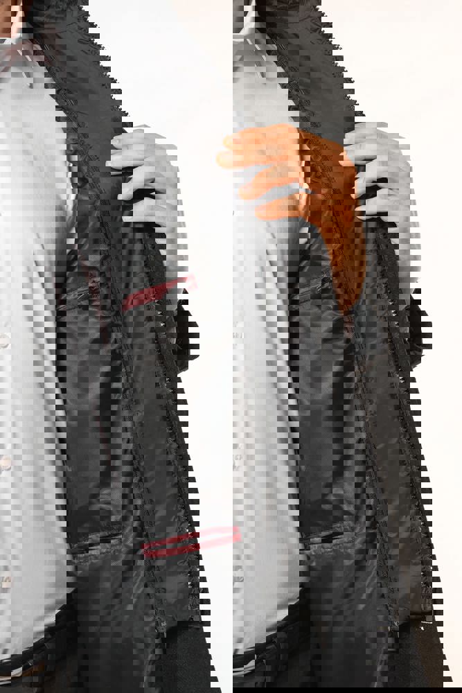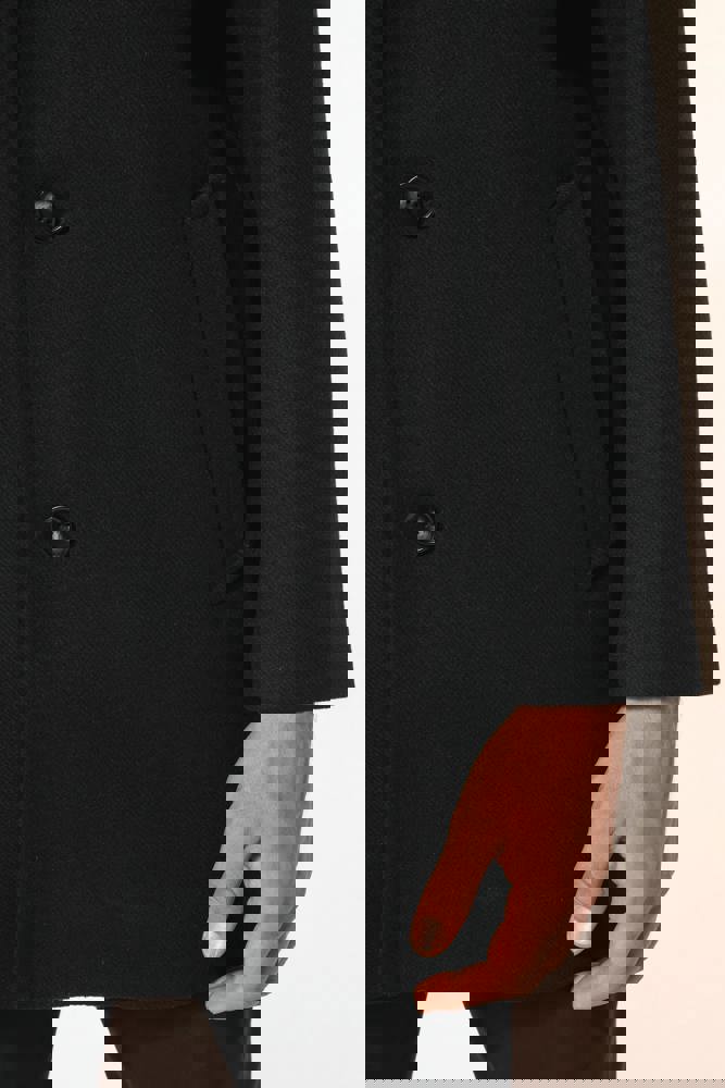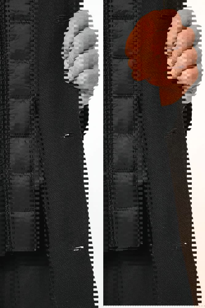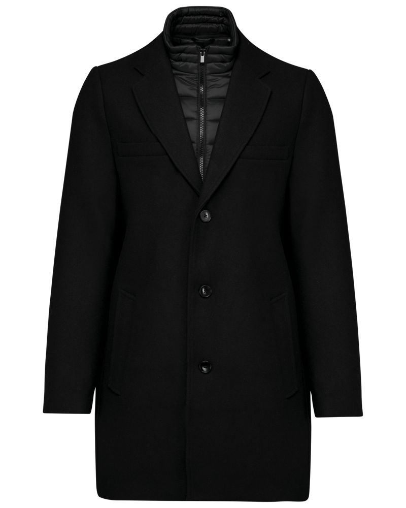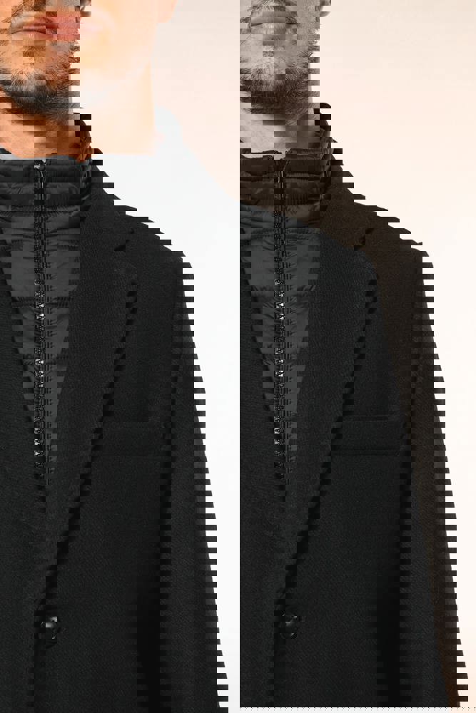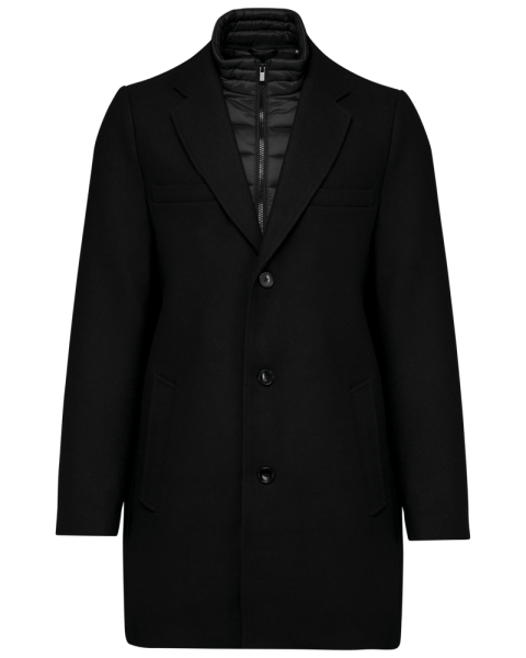 80% poliestere e 20% lana. Panno di lana con costruzione twill. Taglio dritto. Capospalla con parte amovibile in poliammide imbottita e impunturata: collo e pettorina anteriore removibile mediante chiusura interna, invisibile. Zip frontale centrale e cursore in metallo. Due tasche in basso e una tasca sul petto, tutte a filetto. Collo e maniche stile tailleur. Supporto sottocollo in feltro. Chiusura sul davanti con 3 bottoni effetto corno. Spalline. Spacchetto a centro schiena. Fodera interna in poliestere twill. Tasca interna a filetto a contrasto, due tasche sul petto, di cui una con zip, e una tasca per il telefonino. Asola interna per appendere il capo a centro schiena.