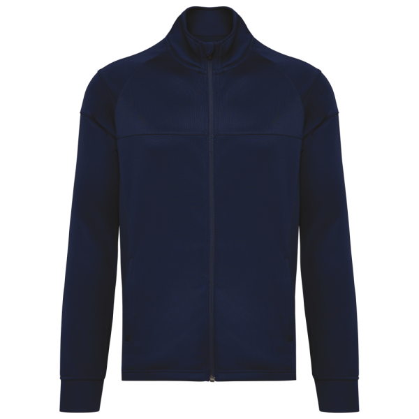 96% poliestere riciclato / 4% elastan. Taglio dritto. Chiusura sul davanti con zip invertita in nylon riciclato tono su tono. Maniche raglan con inserti sulla spalla. Fondo manica nel tessuto principale. 2 tasche con zip sul davanti. Tessuto strutturato tono su tono sui fianchi e sulla schiena. Coprizip nella parte alta del collo per un comfort maggiore. Orlo a fondo capo. Parte posteriore più lunga e spacchetti laterali per garantire comfort. Etichetta con il nome della marca staccabile per semplificare la personalizzazione.