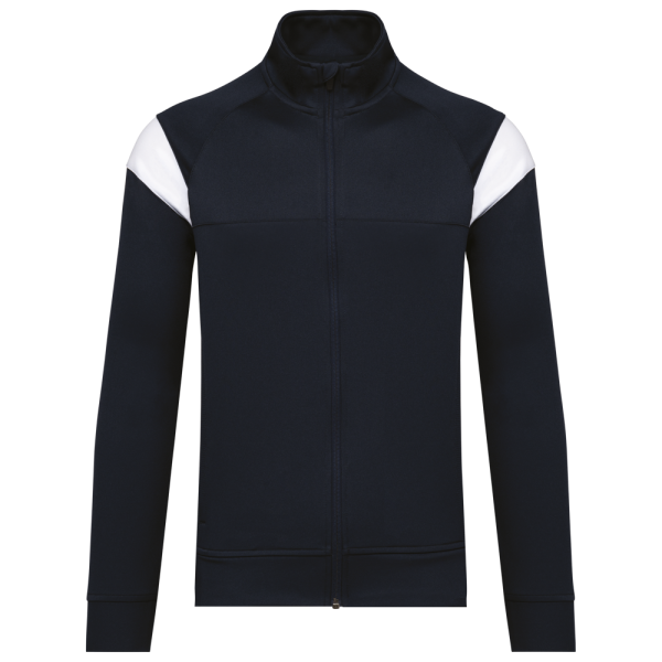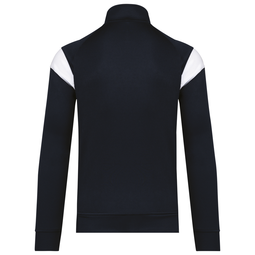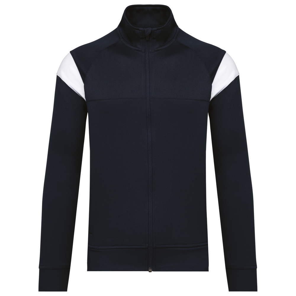 100% poliestere interlock opaco. Taglio dritto. Chiusura sul davanti con zip invertita in nylon tono su tono. Maniche raglan con inserti a contrasto sulla spalla. Profili in tessuto a contrasto su petto e spalla. 2 tasche con zip sul davanti. Inserti in tessuto strutturato su fianchi e schiena. Coprizip nella parte alta del collo per un comfort maggiore. Etichetta con il nome della marca staccabile per semplificare la personalizzazione.