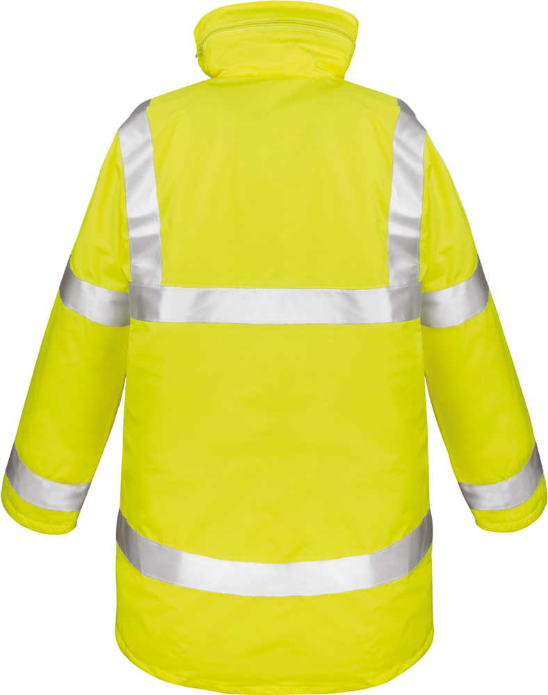 Oxford 100% poliestere con rivestimento in PU. Ovatta 100% poliestere. Fodera in poliestere trapuntato a rombi 190T. Chiusura frontale con zip integrale. 2 tasche bottoni automatici. 1 tasca interna. Tasca per telefono. Cappuccio nascosto nel collo. Occhielli di ventilazione ascellare. Apertura sul retro per un facile accesso alla personalizzazione. Strisce riflettenti 3M ™ Scotchlite ™ sul petto, sulla schiena e sulle maniche. Cuciture completamente nastrate. Impermeabile. Conforme alla norma EN ISO 20471: 2013 Classe 3. GO / RT 3279 Numero 8: 2013 Classe 3 (solo arancione).