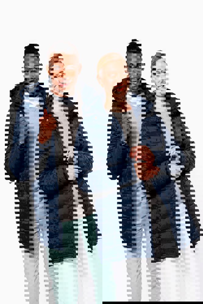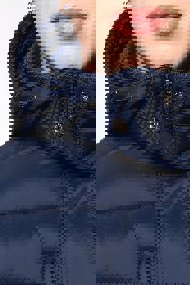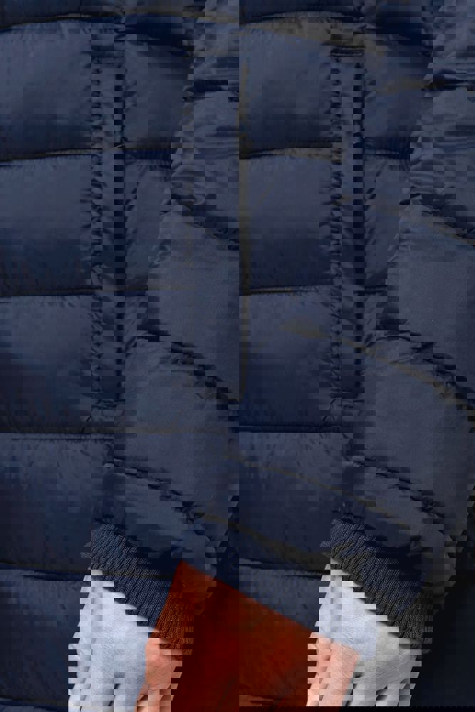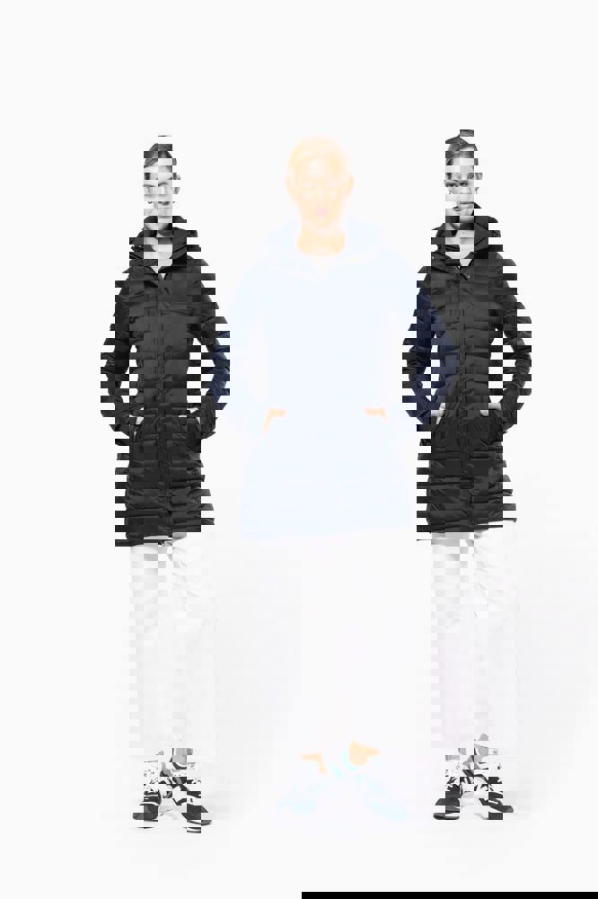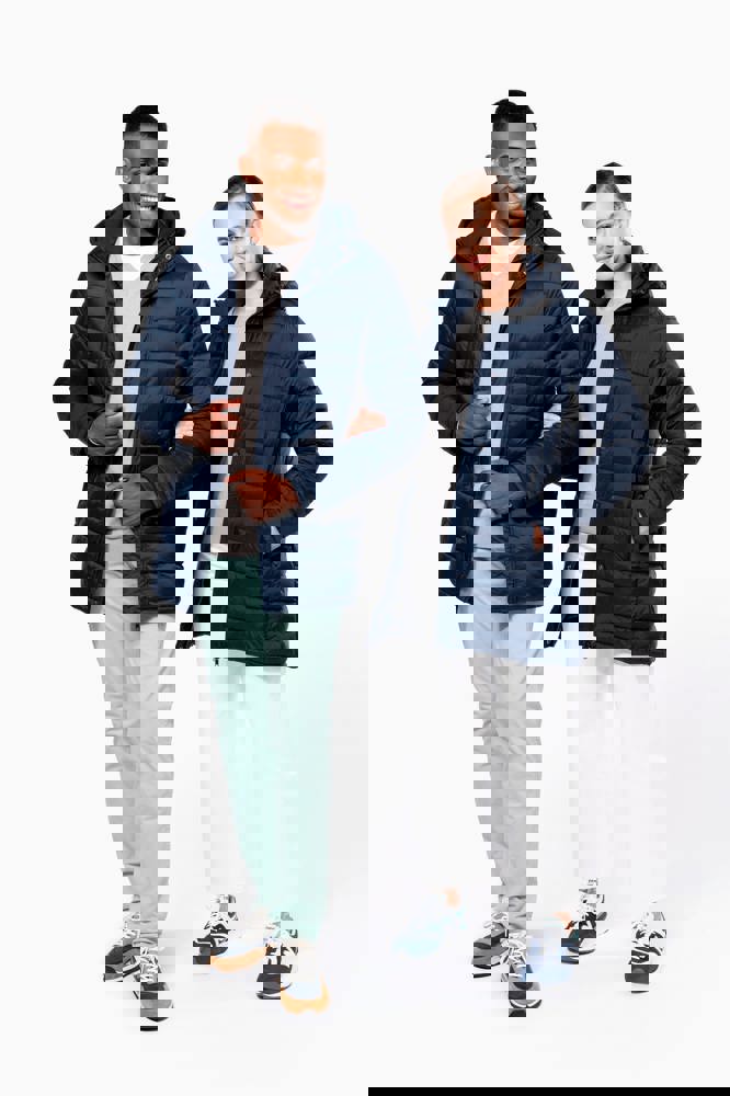 100% poliammide. Imbottitura interna in poliestere. Caldo e ultraleggero. Taglio sagomato. 2 tasche sul davanti e 1 tasca sul petto con zip, a filetto. Chiusura con zip nascosta con pattina e automatici. Interno colletto e polsini a costine. Interno cappuccio e corpo a contrasto: Convoy Grey per Black. Cappuccio e corpo tono su tono: Navy per Navy. Imbottitura iniettata: il peso può variare a seconda delle zone del capo. Il peso totale è indicativo.