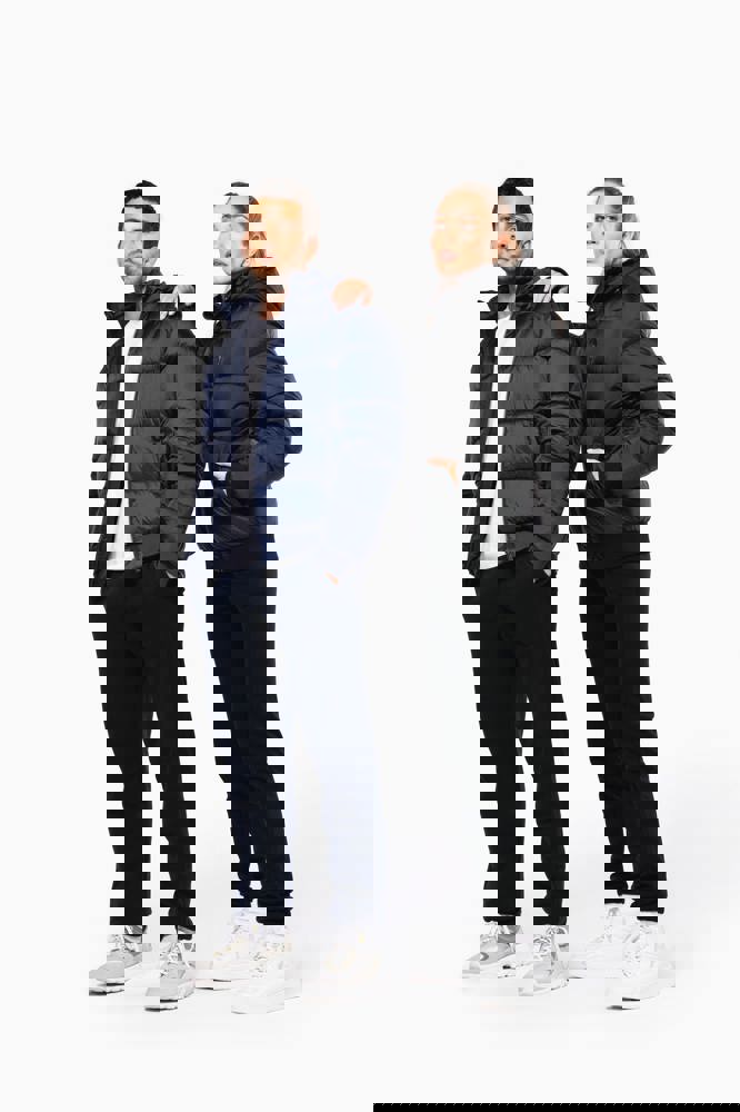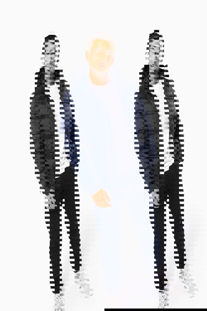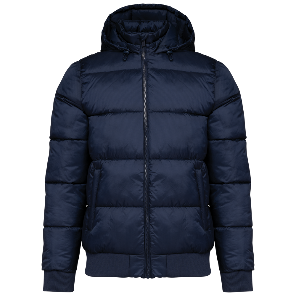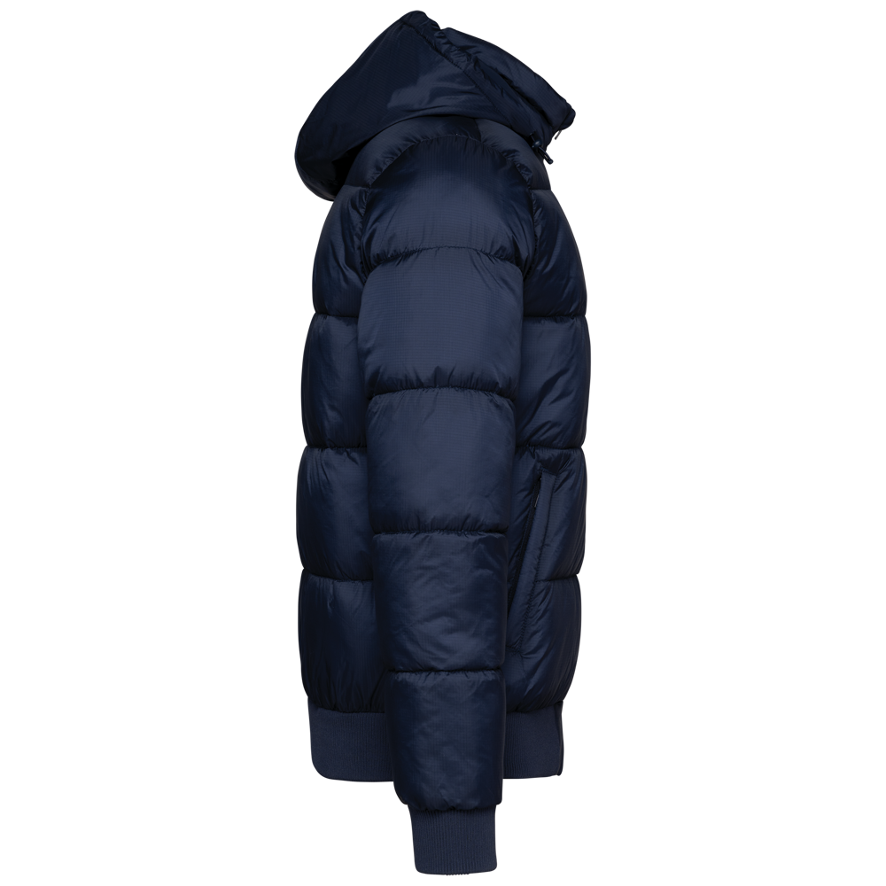 100% poliammide riciclata ripstop 380T. Tessuto idrorepellente. Imbottitura interna 100% poliestere riciclato. Fodera 100% poliammide riciclata. Taglio straight. 2 tasche laterali a filetto con zip. 1 tasca applicata interna con chiusura a strappo. Zip frontale. Collo alto con cappuccio a 3 pannelli foderato, imbottito e regolabile tramite uno stopper. Fondo manica e fondo capo a costine. Zip invisibile all'interno del lato cuore e a fondo capo per apertura e personalizzazione. Imbottitura iniettata: il peso può variare a seconda delle zone del capo. Il peso totale è indicativo.