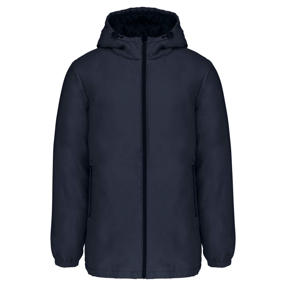 100% poliestere riciclato post-consumer. Tessuto idrorepellente. Finitura manopesca per una maggiore morbidezza al tatto. Fodera poliestere taffetà 210T nero. Interno imbottito: 100% poliestere. Taglio comfort. Zip in nylon e cursore in metallo. Cappuccio 3 pannelli foderato in poliestere con coulisse e stopper. 2 tasche anteriori con zip. 1 tasca interna con chiusura a strappo. Fondo manica elasticizzato. Parte posteriore più lunga per un maggior comfort. Patch in tessuto sull'interno collo per la personalizzazione. Zip invisibile lato cuore e a fondo capo per apertura e personalizzazione. Nessuna etichetta del marchio, per semplificare la personalizzazione.