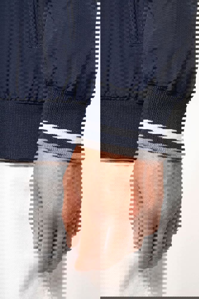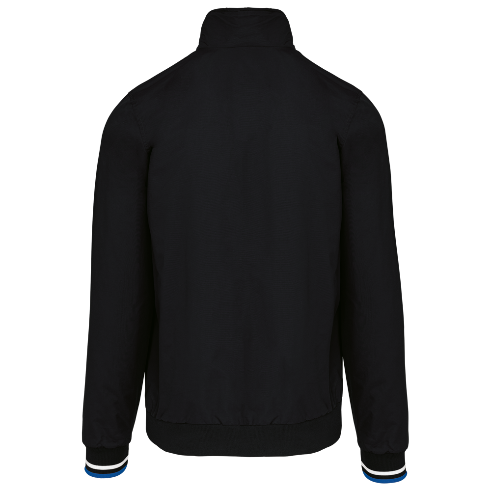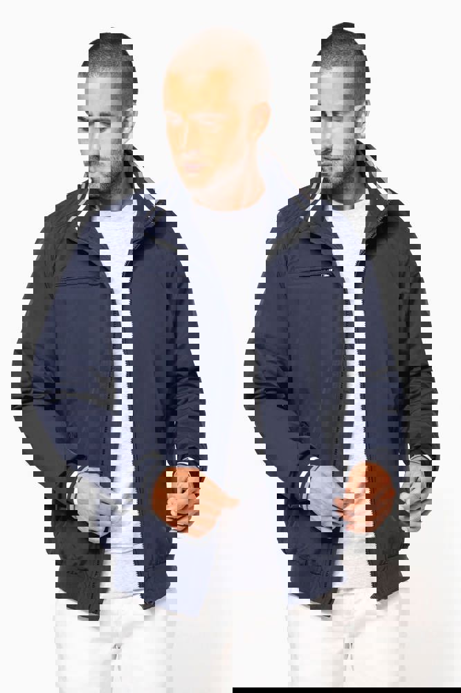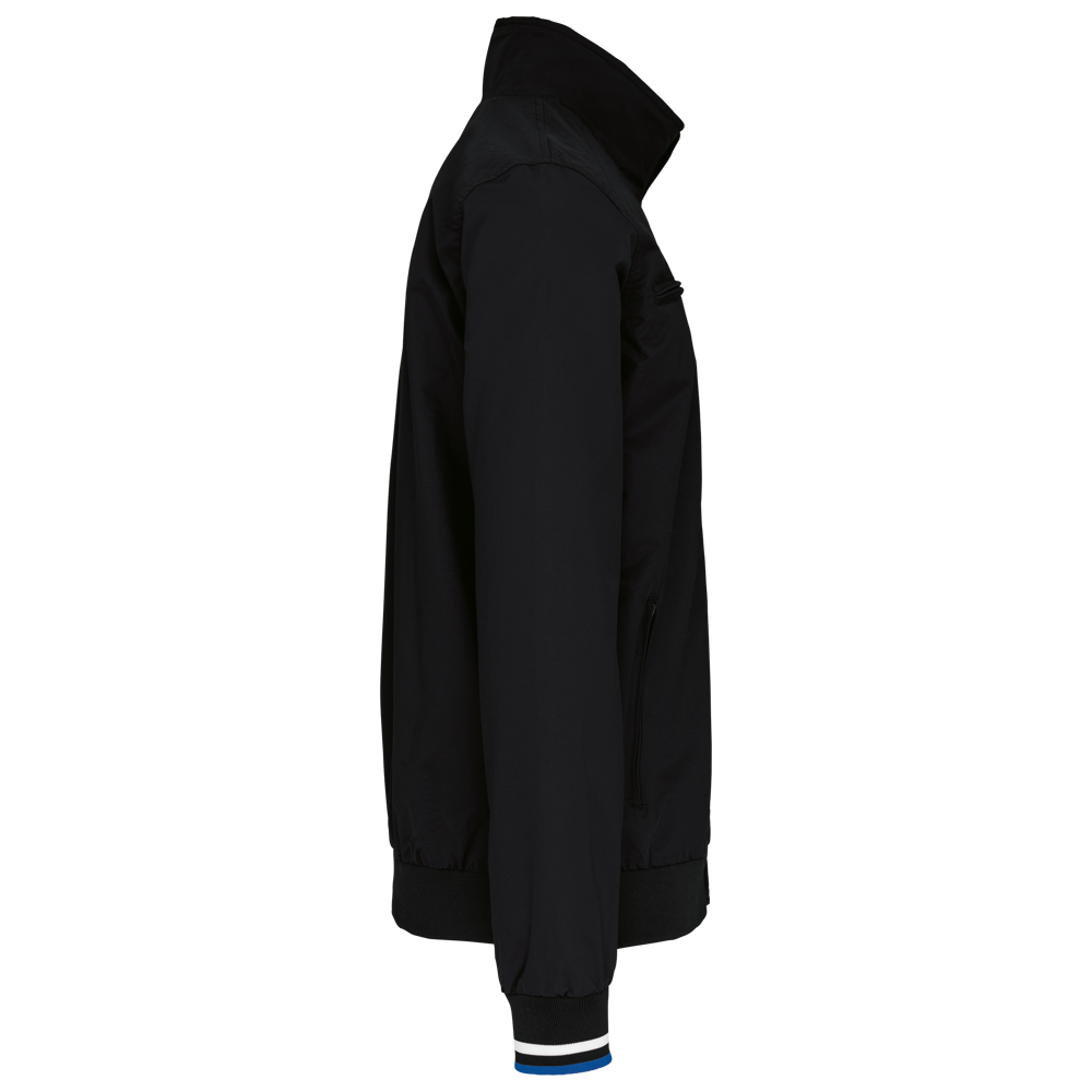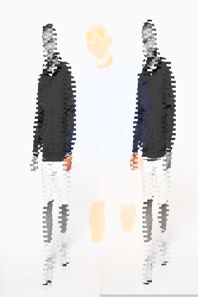 100% Poliammide Taslon Ottoman. Fodera in rete 100% Poliestere. Tessuto resistente. 2 tasche con zip sul davanti. 1 tasca con zip sul petto. 1 tasca interna. Interno collo e polsini a costine con strisce in contrasto di colore. Fodera in rete con accesso zip per facilitare la personalizzazione. Girovita in costina.
