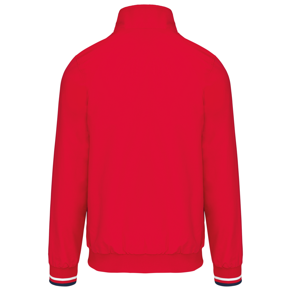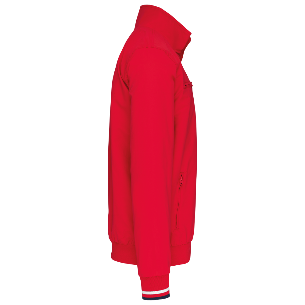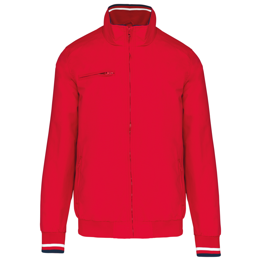 100% Poliammide Taslon Ottoman. Fodera in rete 100% Poliestere. Tessuto resistente. 2 tasche con zip sul davanti. 1 tasca con zip sul petto. 1 tasca interna. Interno collo e polsini a costine con strisce in contrasto di colore. Fodera in rete con accesso zip per facilitare la personalizzazione. Girovita in costina.