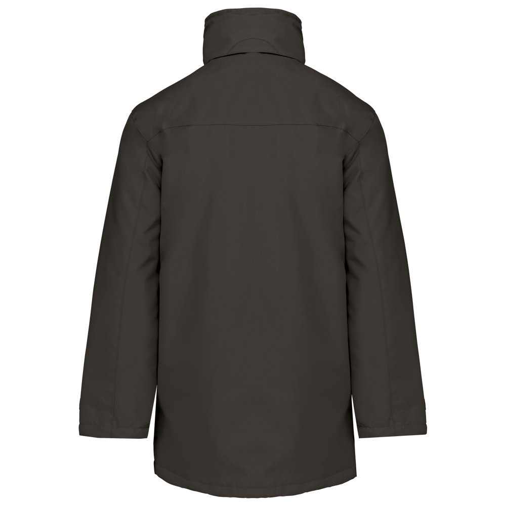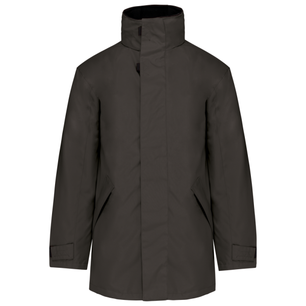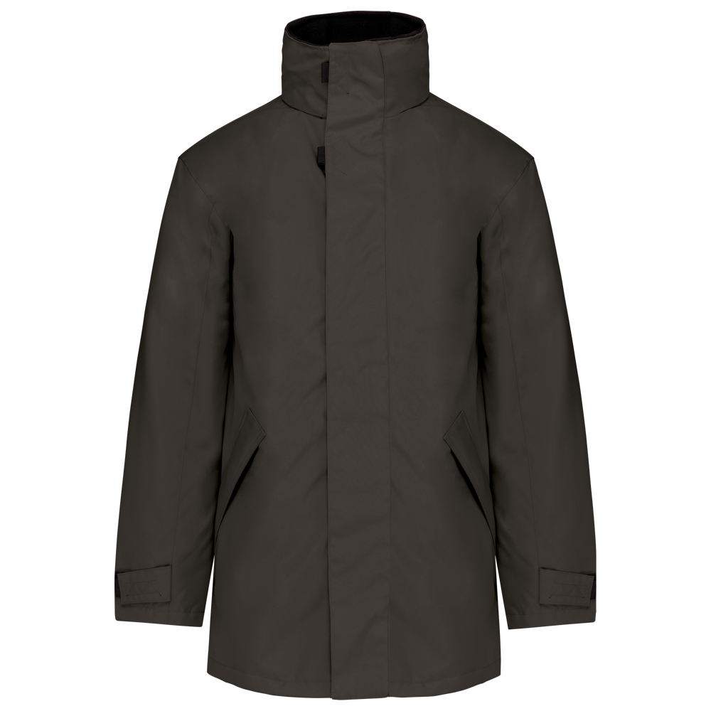 Giaccone Parka. Esterno: 100% Poliestere Oxford. Interno: Poliestere e imbottitura. 2 tasche esterne con zip. 2 tasche interne di cui una porta-cellulare. Cappuccio a scomparsa. Interno collo in Pile. Zip interna per facilitare la personalizzazione.