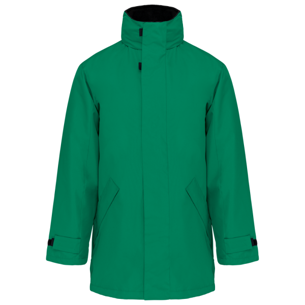 Giaccone Parka. Esterno: 100% Poliestere Oxford. Interno: Poliestere e imbottitura. 2 tasche esterne con zip. 2 tasche interne di cui una porta-cellulare. Cappuccio a scomparsa. Interno collo in Pile. Zip interna per facilitare la personalizzazione.