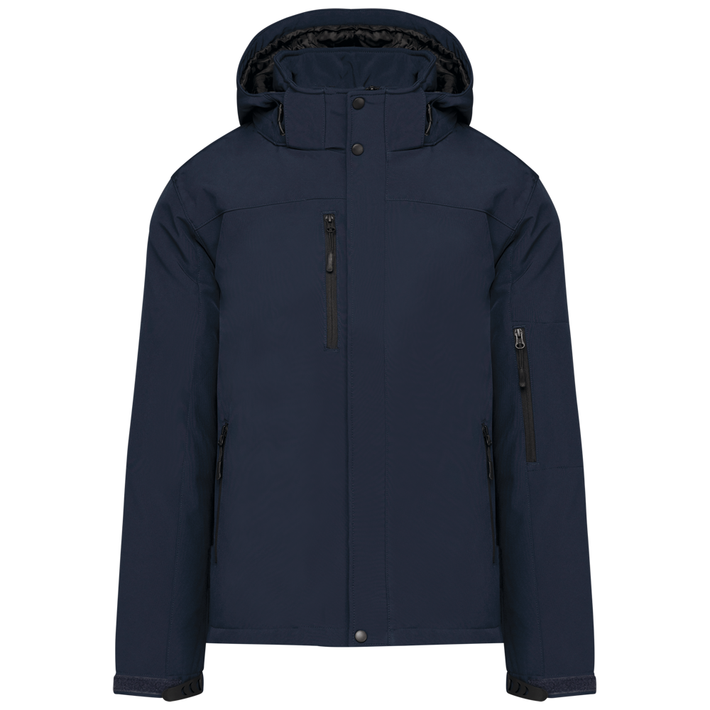 95% poliestere / 5% elastan. Tessuto incollato 3 strati traspirante 3.000 g/m² /24 h e impermeabile 8.000 mm. Esterno : 95% poliestere / 5% elastan. Strato intermedio: membrana traspirante. Strato interno : micropile. Fodera imbottita 100% poliestere. Lato anteriore : 4 tasche con zip (2 laterali, 1 sulla manica, 1 petto a destra). 2 tasche interne con automatico. Cappuccio staccabile 3 pannelli foderati e imbottiti, regolabile con stopper. Fondo manica regolabile con velcro. 1 zip lato cuore e 1 zip a fondo capo per apertura e personalizzazione.