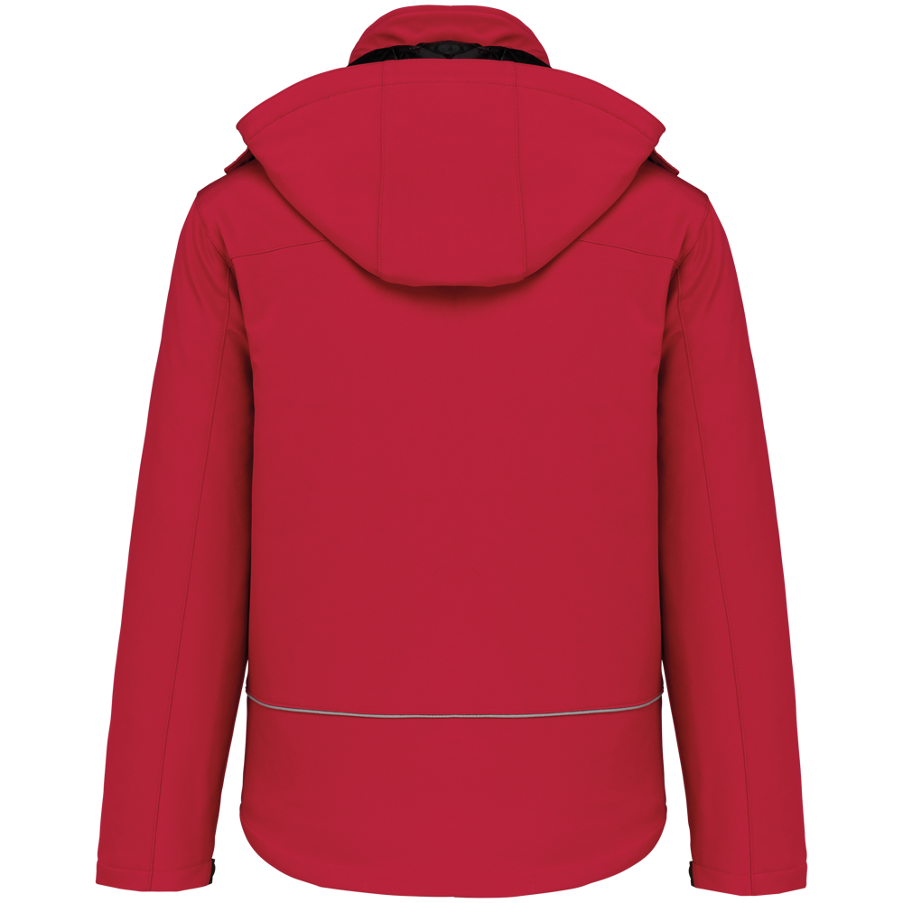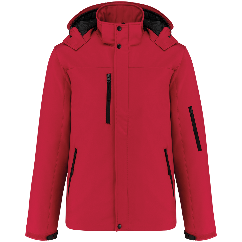 95% poliestere / 5% elastan. Tessuto incollato 3 strati traspirante 3.000 g/m² /24 h e impermeabile 8.000 mm. Esterno : 95% poliestere / 5% elastan. Strato intermedio: membrana traspirante. Strato interno : micropile. Fodera imbottita 100% poliestere. Lato anteriore : 4 tasche con zip (2 laterali, 1 sulla manica, 1 petto a destra). 2 tasche interne con automatico. Cappuccio staccabile 3 pannelli foderati e imbottiti, regolabile con stopper. Fondo manica regolabile con velcro. 1 zip lato cuore e 1 zip a fondo capo per apertura e personalizzazione.