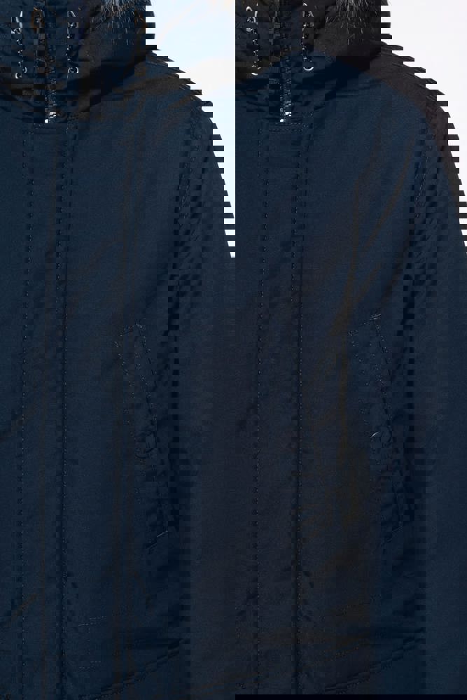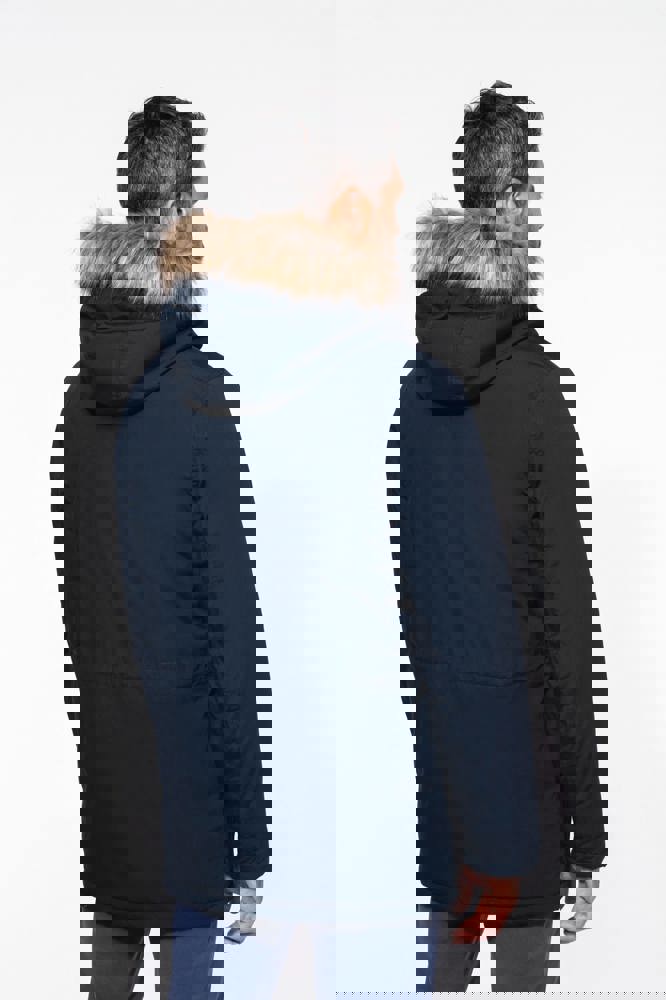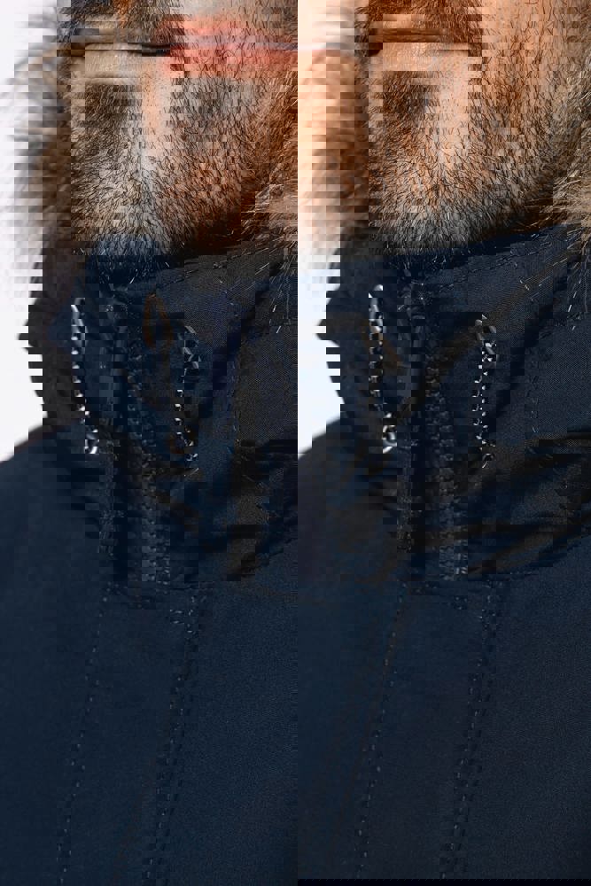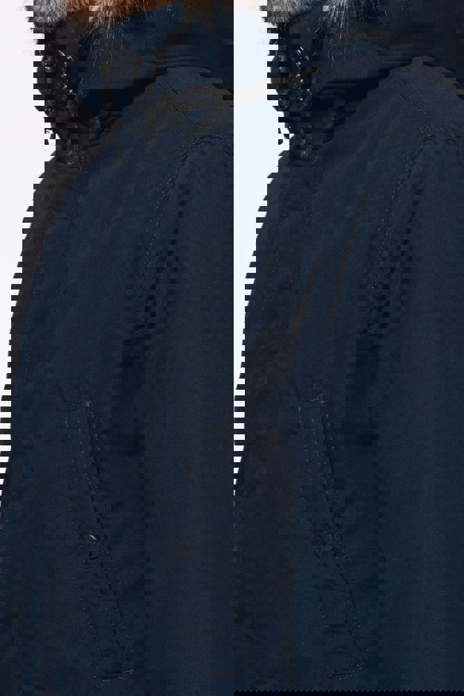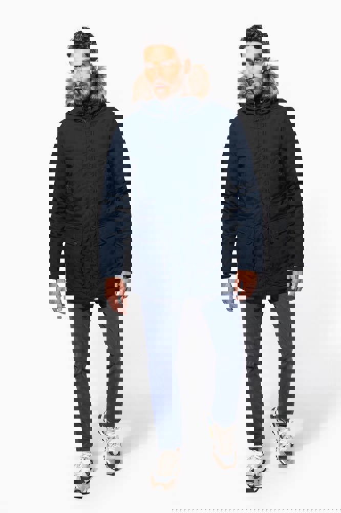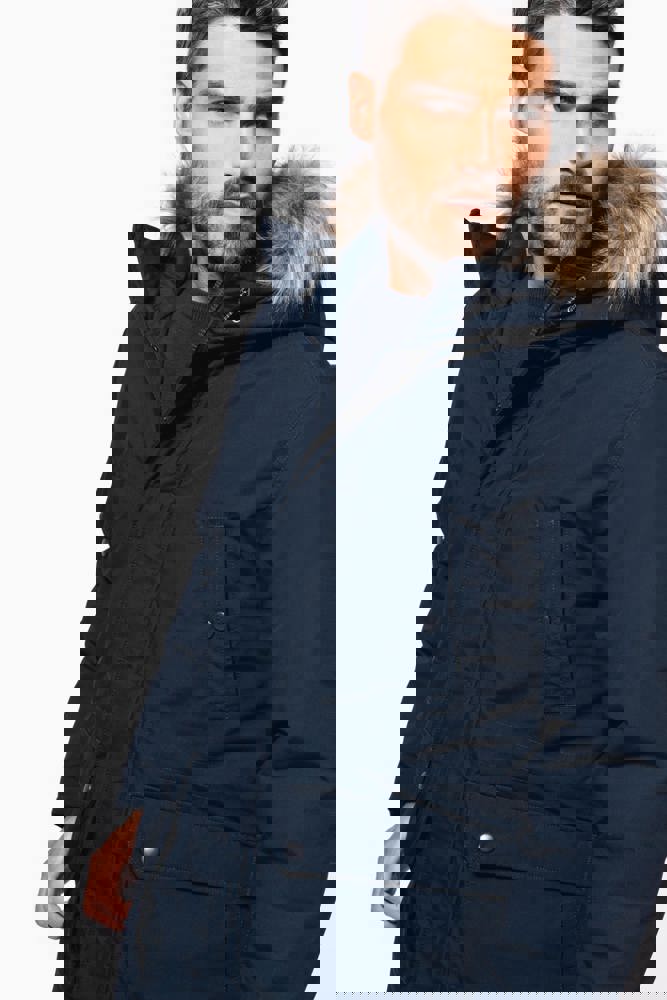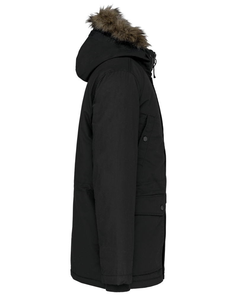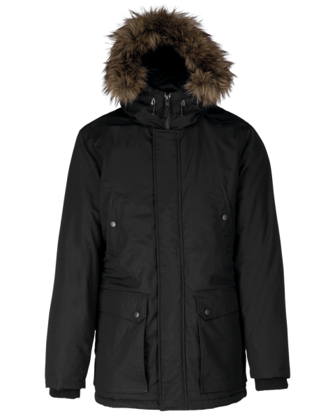 Tela spessa 65% poliestere / 35% cotone. Fodera imbottita 100% poliestere. Chiusura con zip nascosta con pattina e automatici. Cappuccio foderato e imbottito con pelliccia finta staccabile. 4 tasche esterne sul davanti: 2 grandi tasche a doppia apertura sul petto con patta a pressione e 2 tasche a filetto sul petto con automatico. 1 tasca interna con chiusura a velcro. Girovita regolabile con coulisse interna. Polsini interni a costine. 1 zip lato cuore e 1 zip a fondo capo per apertura e personalizzazione.