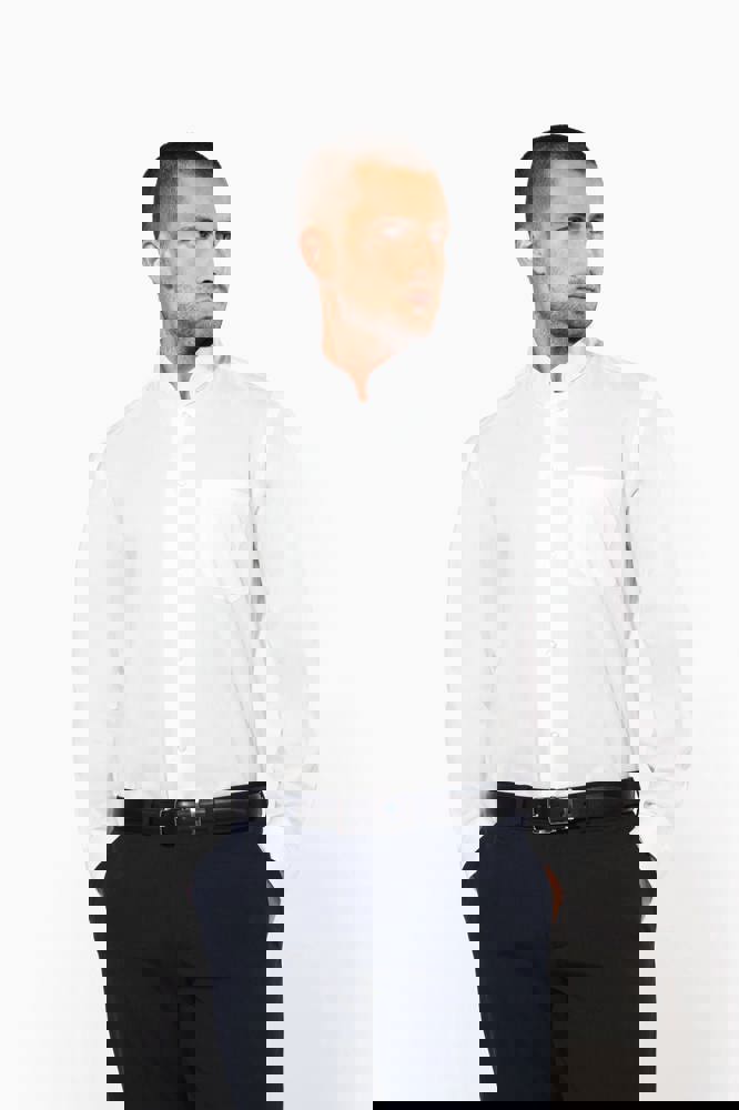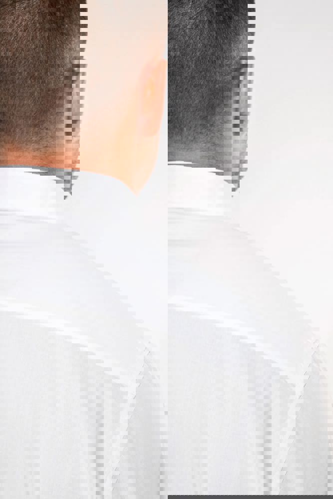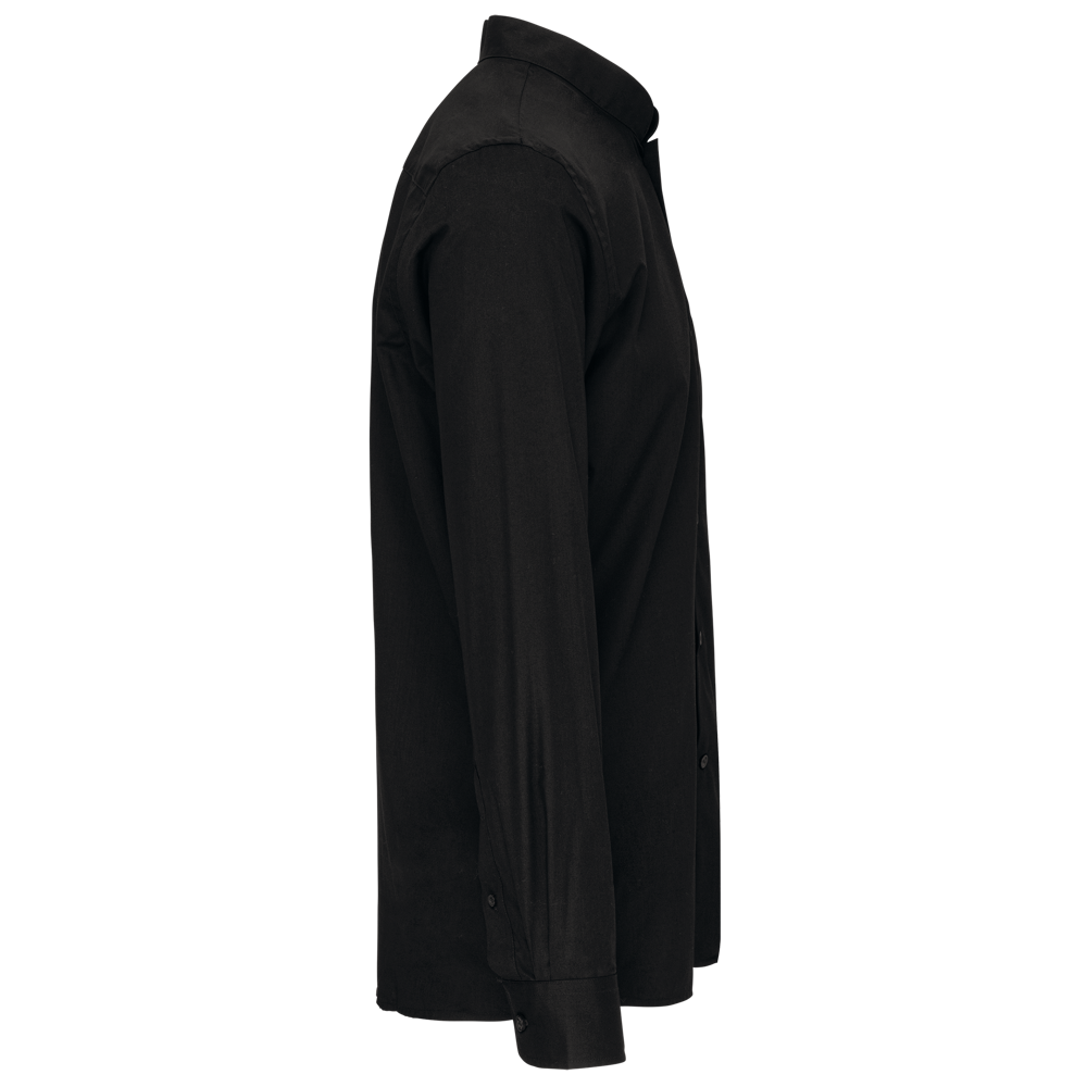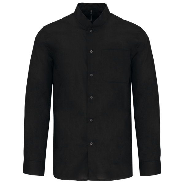 65% poliestere / 35% popeline di cotone. Tessuto facile da stirare. Collo alla coreana. Bottoni colorati. Taschino sul petto a sinistra. Polsini arrotondati regolabili con abbottonatura antistrappo. 2 bottoni di riserva.