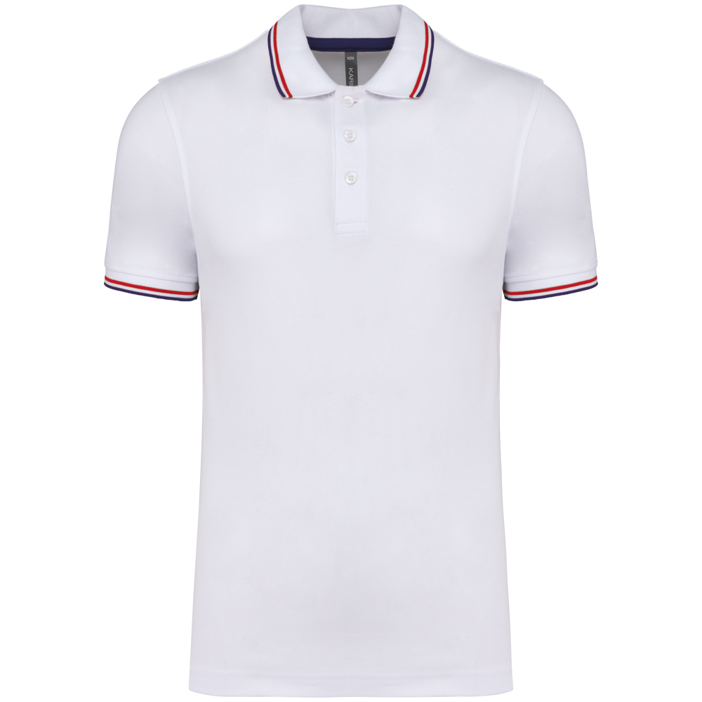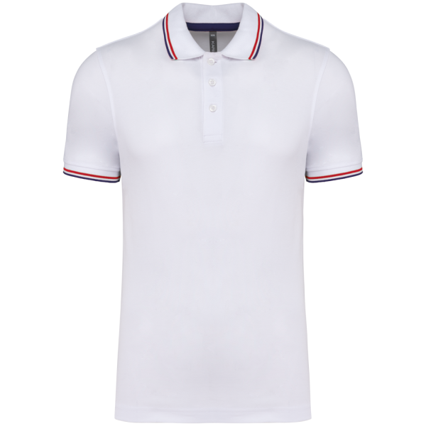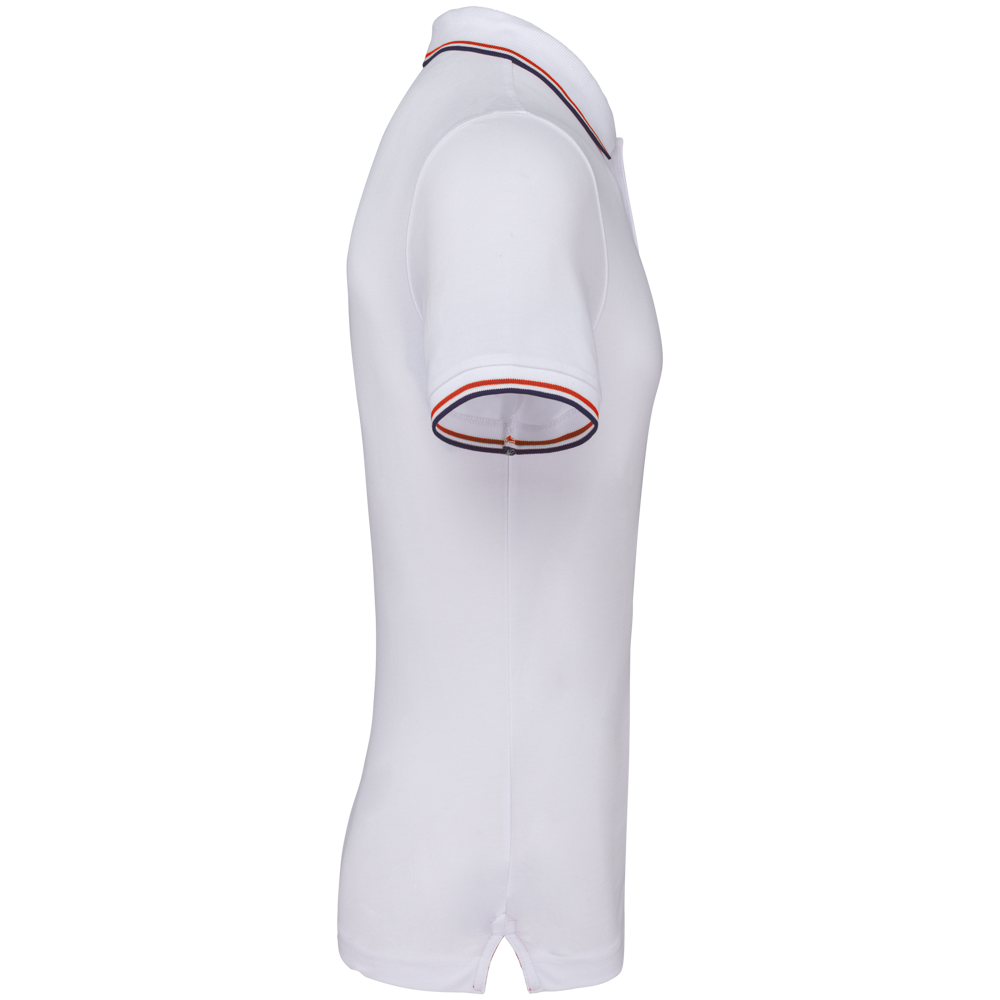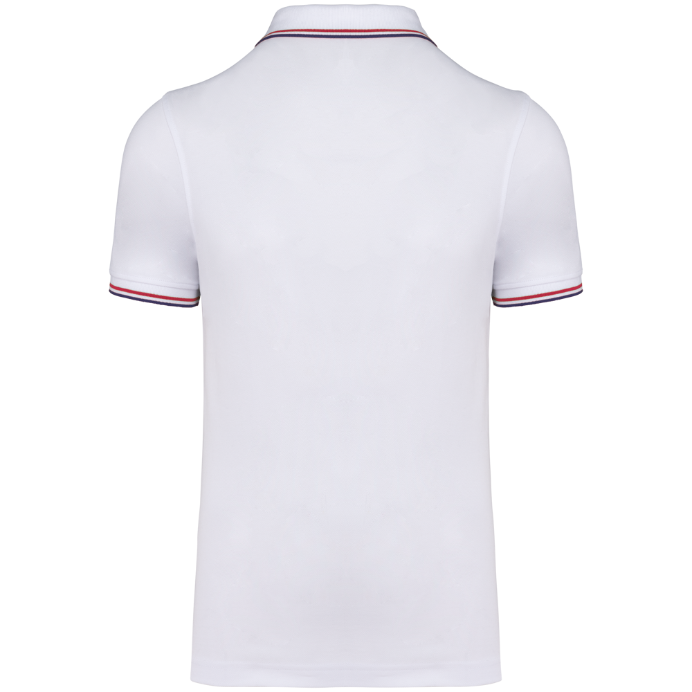 100% cotone piqué. 3 bottoni. Collo in contrasto, in costina e spacchetti laterali. Costine con profili in contrasto sul collo e polsini. Cuciture a doppio ago.