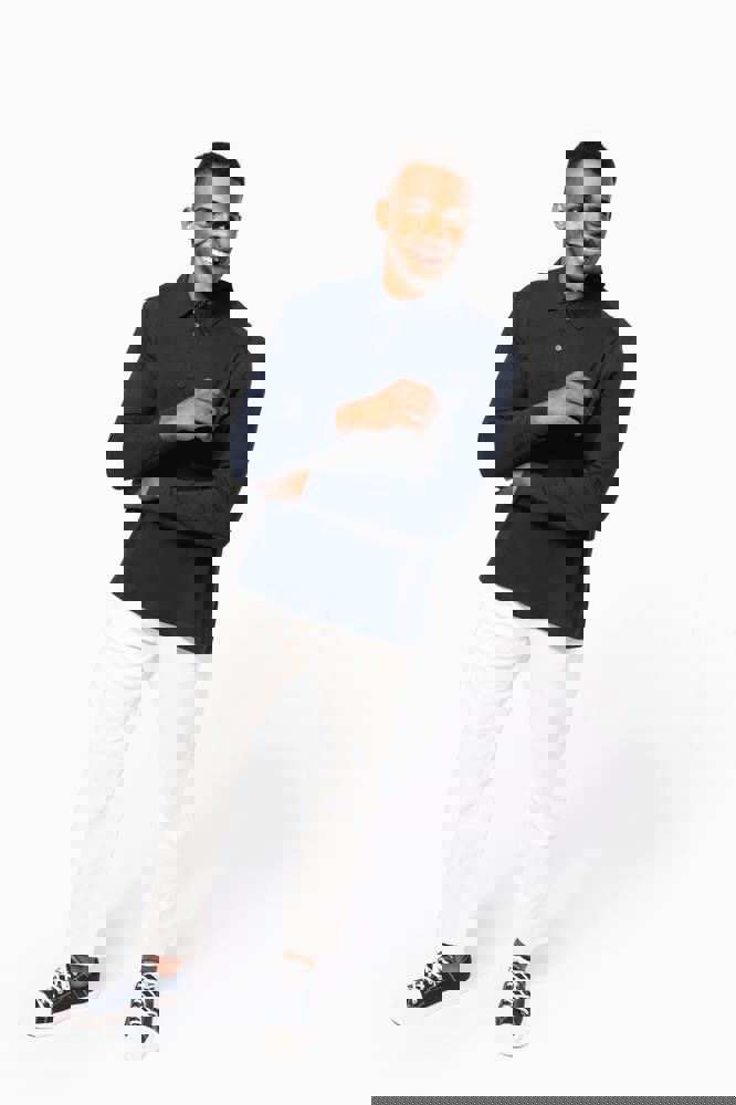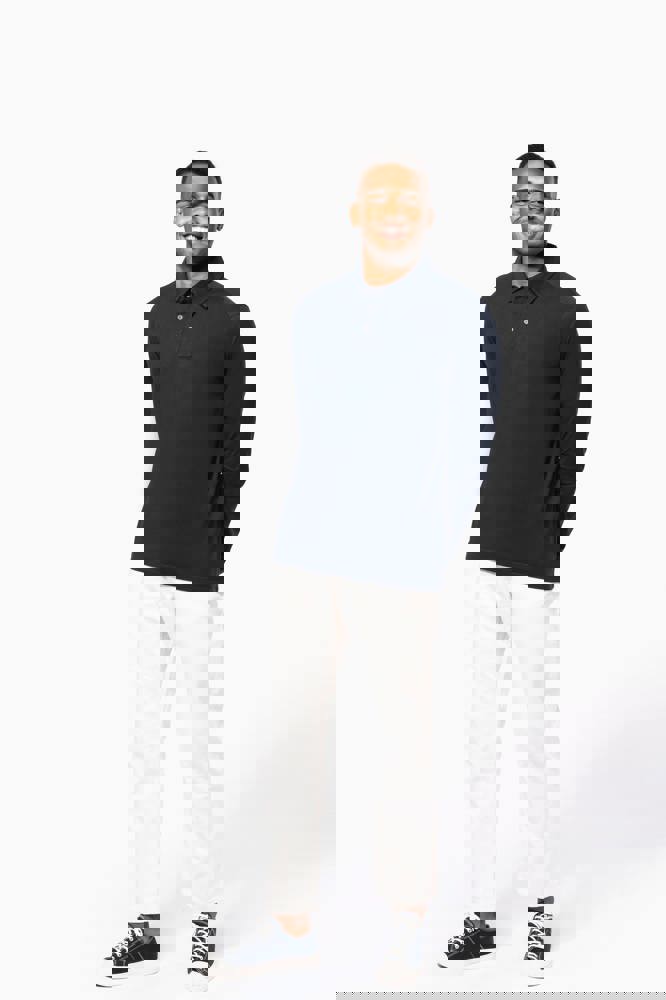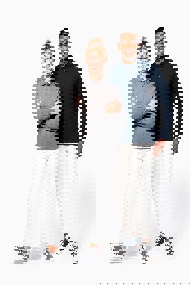 100% cotone (Grey Heather: 65% poliestere / 35% cotone - Oxford Grey : 90% cotone / 10% viscosa). Maglia jersey in cotone pettinato. Collo a camicia. Pattina con 3 bottoni in metallo. Inserto sulla spalla. Polsini a costine. Doppia impuntura a fondo capo.