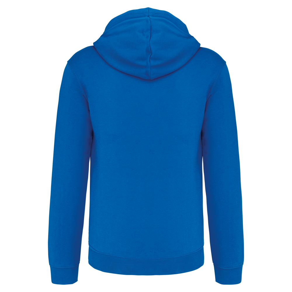 80% cotone / 20% poliestere. Cotone pettinato. Felpa garzata. Tasca a marsupio con accesso per auricolari. Fondo manica e fondo capo a costine. Cappuccio a contrasto foderato, con coulisse. Zip a contrasto.