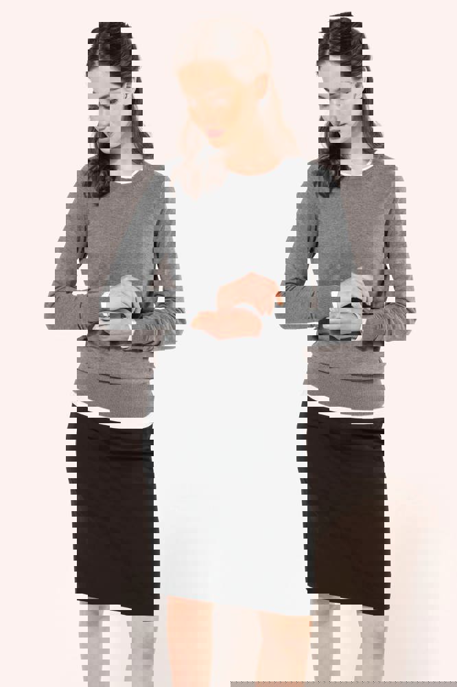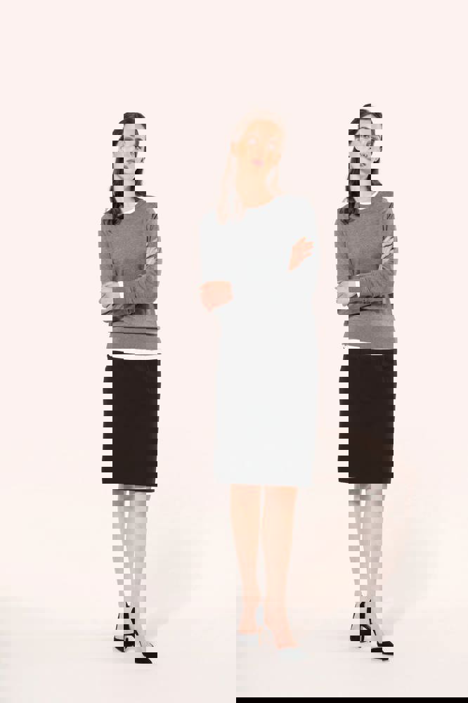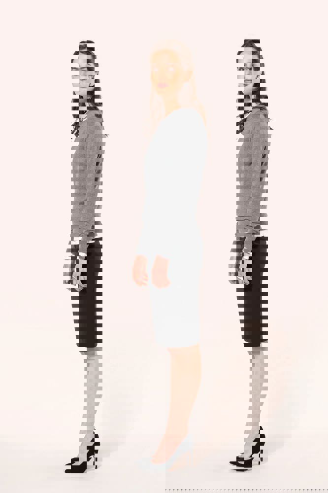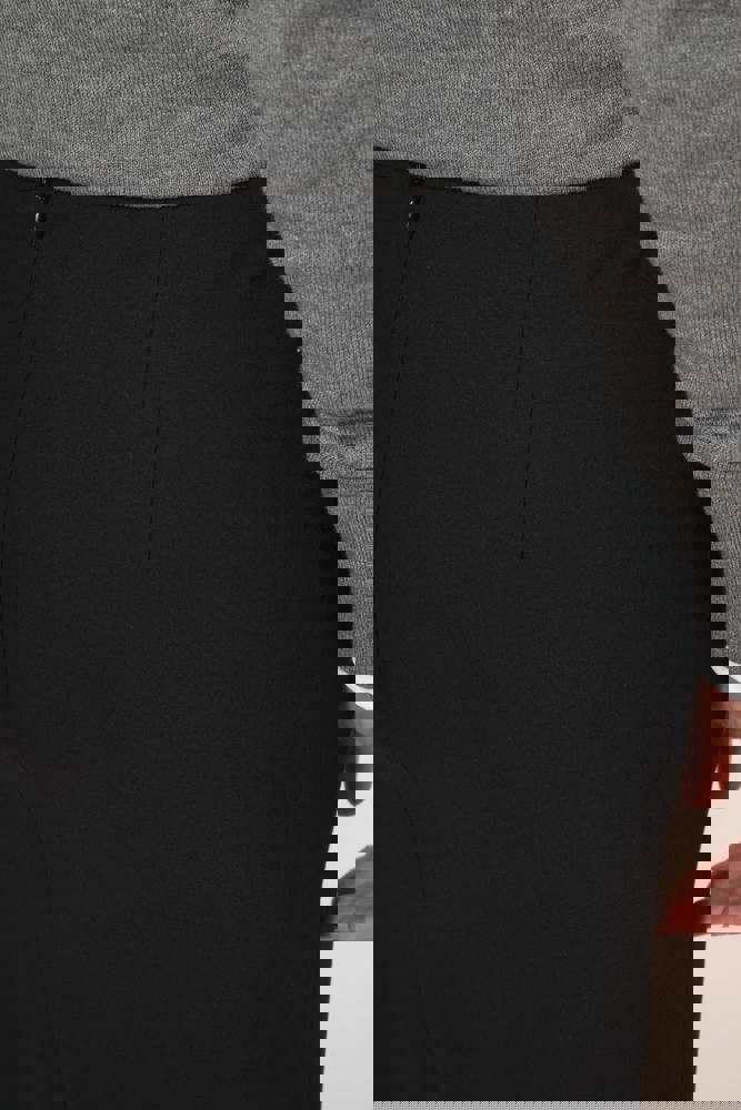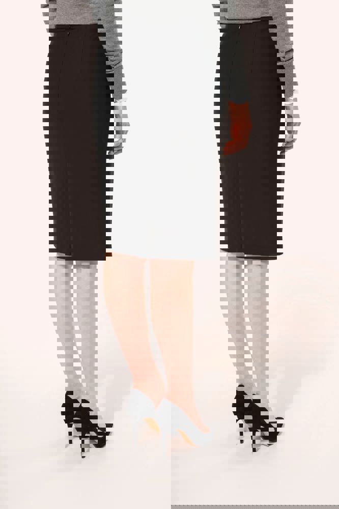 50% poliestere / 23% viscosa / 22% lana / 5% elastan. Fodera 100% poliestere stretch. 2 pince davanti in vita e 2 pince sul retro. Zip di apertura sul retro, protetta all'interno da un sottoponte tenuto in posizione da un bottone per un maggiore comfort. Spacchetto posteriore a fondo gonna, fodera a farfalla con spacchetto. Taglio dritto. Nessuna etichetta con il nome del marchio; solo una piccola etichetta con l'indicazione della taglia per semplificare la personalizzazione.