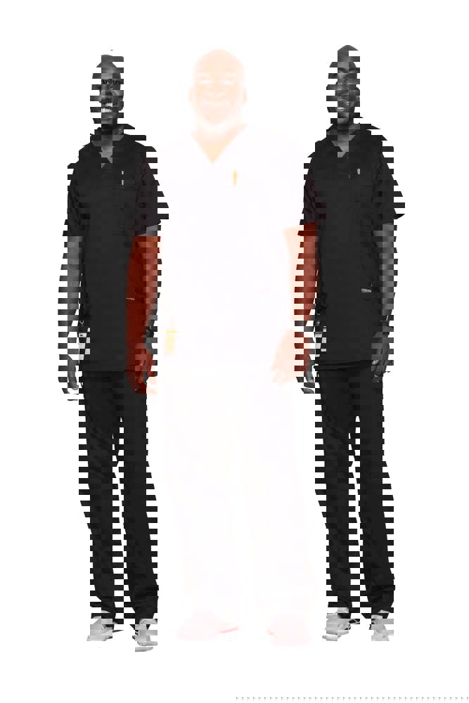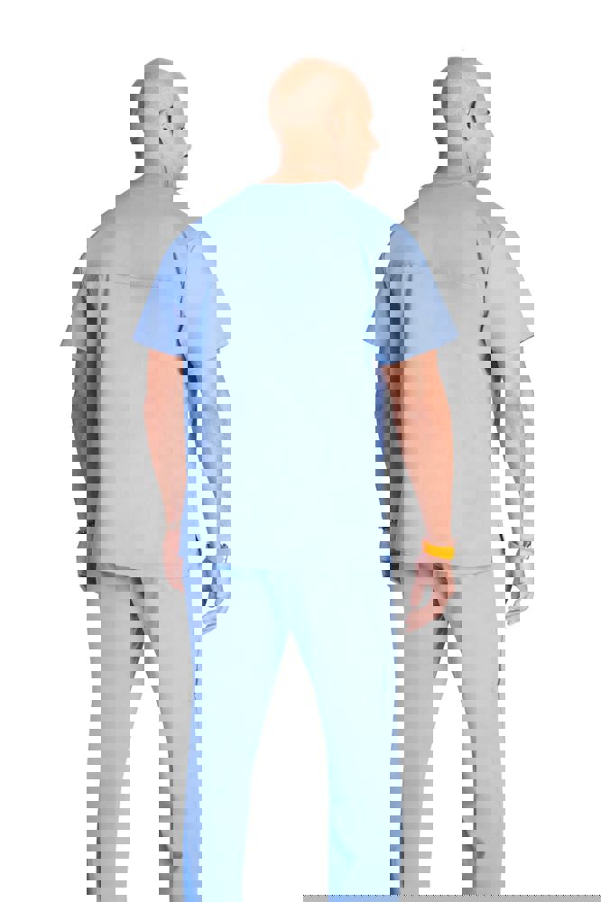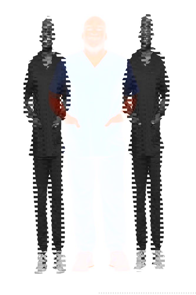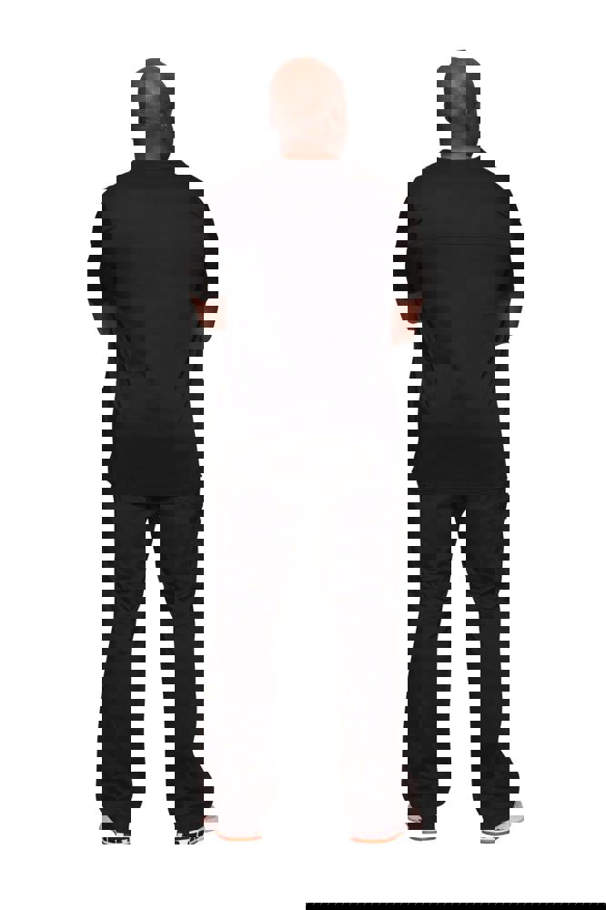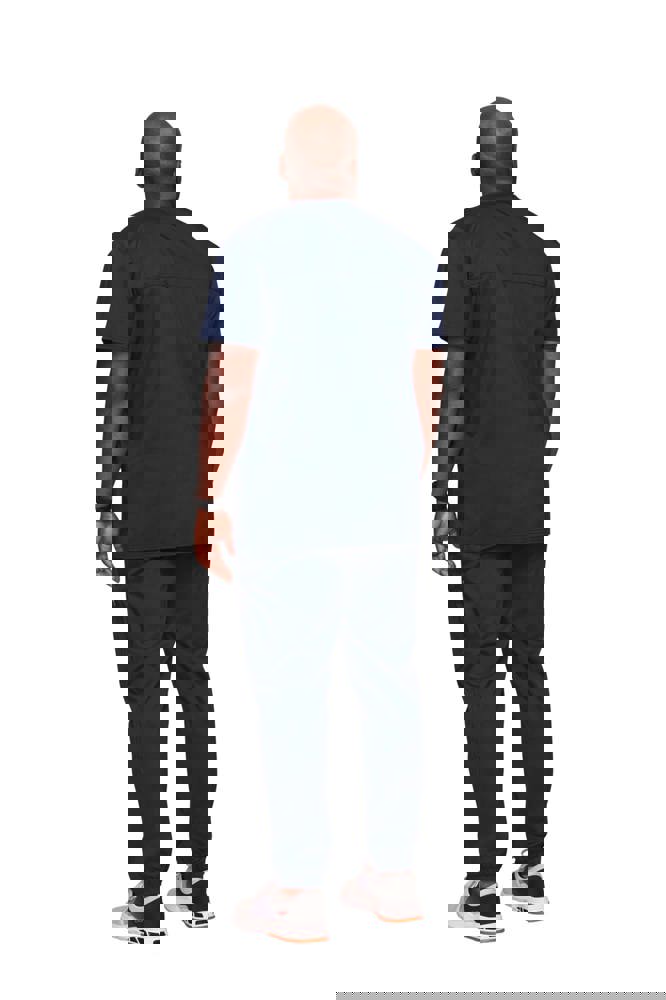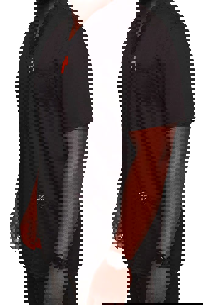 78% poliestere / 20% viscosa / 2% elastan. Tessuto pettinato. Taglio maschile. Tasca sul petto con portapenna. Due tasche applicate. Etichette con logo e passante elasticizzato. Giogo posteriore. Aperture di aerazione laterali.