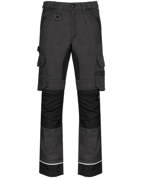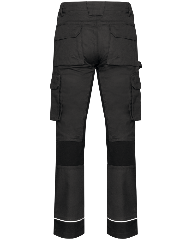 60% cotone / 40% poliestere riciclato. Lavaggio a 60 °C. Taglio dritto. 2 tasche frontali (sacco tasca nel tessuto principale), di cui 1 con taschino. 2 tasche cargo a soffietto, staccate dal pantalone negli angoli inferiori, con patta e chiusura in velcro, di cui una con 2 scomparti e spazi per utensili; tasca per penne sul lato destro. 2 tasche posteriori a soffietto con patta e chiusura in velcro, porta martello a sinistra. Schiuma comfort sulle ginocchia integrata in una tasca in Cordura® a contrasto (nero per tutti i colori). Inserto estensibile a contrasto (tranne per il colore nero) sul cavallo e dietro le ginocchia per una maggiore resistenza e massima libertà di movimento. Inserto in Cordura® a fondo gamba con piping silver e orlo regolabile di 5 cm. Tripla cucitura sul centro dietro e davanti. Doppia cucitura sui lati e sul cavallo. Girovita con anello in plastica + passanti regolabili grazie a un elastico. Ampio passante sul lato posteriore del girovita. Chiusura con bottone e zip (bottone in metallo ricoperto in plastica). Etichetta con il nome della marca rimovibile. Venduto senza accessori. Compatibile con WKI0306: tasche portautensili estraibili.