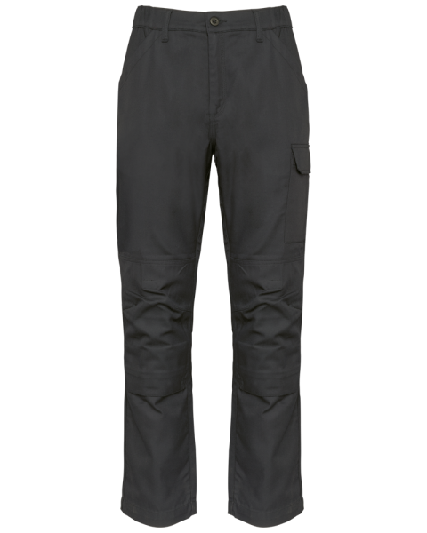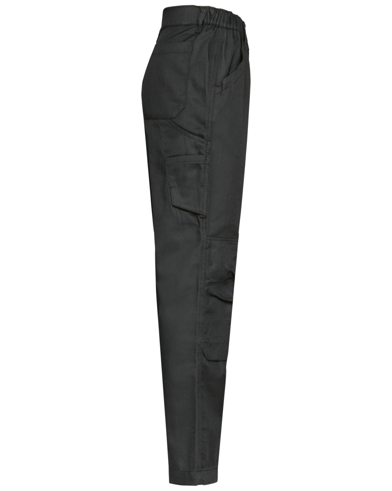 60% cotone / 40% poliestere. Tessuto pettinato. Lavaggio a 60 °C. Taglio dritto. 2 tasche frontali (sacco tasca nel tessuto principale). 1 tasca con patta e chiusura in velcro sul lato sinistro, 1 tasca doppia porta-utensili a destra, 2 tasche posteriori applicate, 2 tasche per ginocchiere tono su tono con velcro e patta interna per mantenere in posizione ed adattare le ginocchiere. Girovita in parte elasticizzato con passanti. Zip e bottone. Bottone in plastica. Soffietto sul cavallo per una maggiore resistenza e massima libertà di movimento. Doppia cucitura sui fianchi, tripla cucitura su soffietto e sul centro davanti/dietro. Impunture a nervature nel cavallo. Orlo a fondo gamba. Etichetta con il nome del marchio rimovibile. Ginocchiere NON fornite.