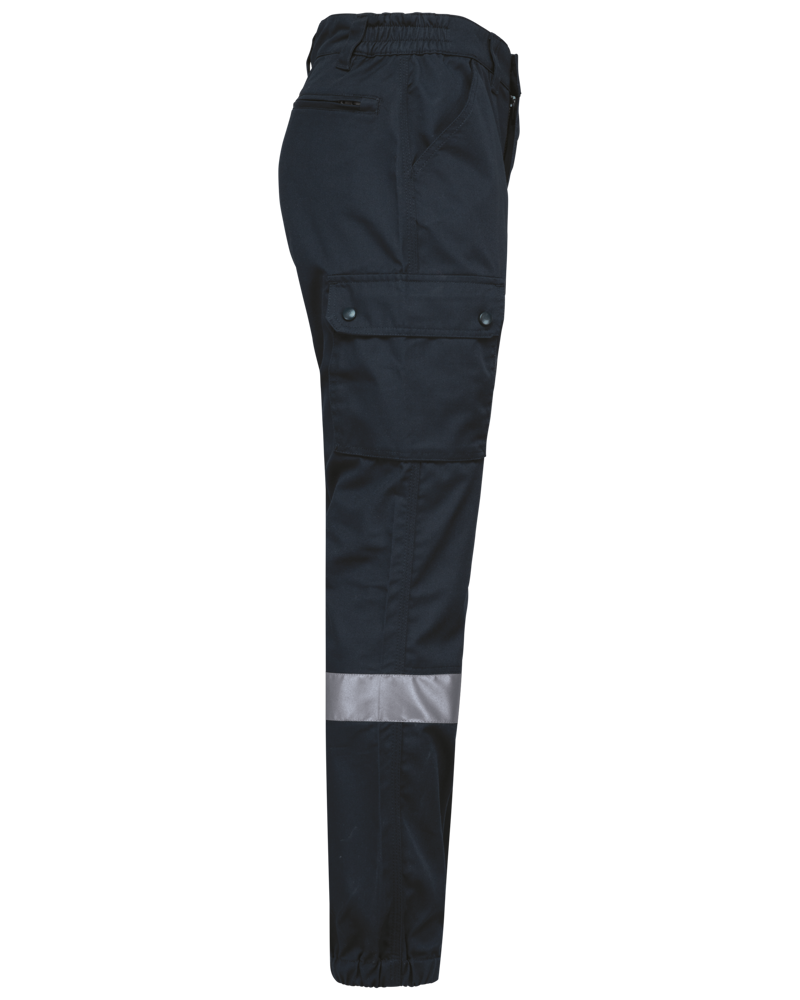 65% poliestere / 35% cotone. Tessuto pettinato. Lavaggio a 60 °C. Taglio straight. 2 tasche davanti. 2 tasche laterali a soffietto con patta e chiusura con automatici. 1 tasca posteriore a filetto chiusa con zip. Inserti di rinforzo sulle ginocchia nel tessuto principale tono su tono. Girovita elasticizzato sui fianchi con passanti rinforzati, di cui uno centrale più alto (8 cm) dietro. Chiusura con zip e con bottone in plastica. Fondo gamba elasticizzato con bordino riflettente (Norma EN 17353- EN ISO 13688). Cuciture a tripla impuntura su cavallo, fianchi e centro davanti e dietro per una maggiore resistenza. Etichetta con il nome della marca rimovibile.