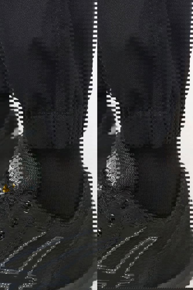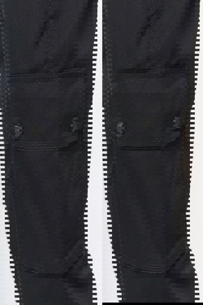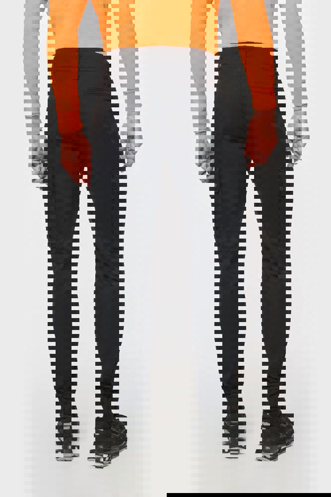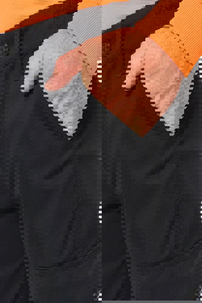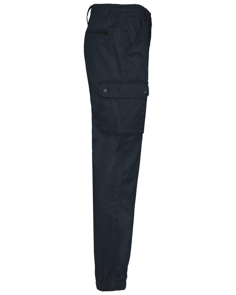 65% poliestere / 35% cotone. Tessuto pettinato. Lavaggio a 60 °C. Taglio straight. 2 tasche davanti. 2 tasche laterali a soffietto con patta e chiusura con automatici. 1 tasca posteriore a filetto chiusa con zip. Inserti di rinforzo sulle ginocchia nel tessuto principale tono su tono. Girovita elasticizzato sui fianchi con passanti rinforzati, di cui uno centrale più alto (8 cm) dietro. Chiusura con zip e con bottone in plastica. Fondo gamba elasticizzato. Cuciture a tripla impuntura su cavallo, fianchi e centro davanti e dietro per una maggiore resistenza. Etichetta con il nome della marca rimovibile.