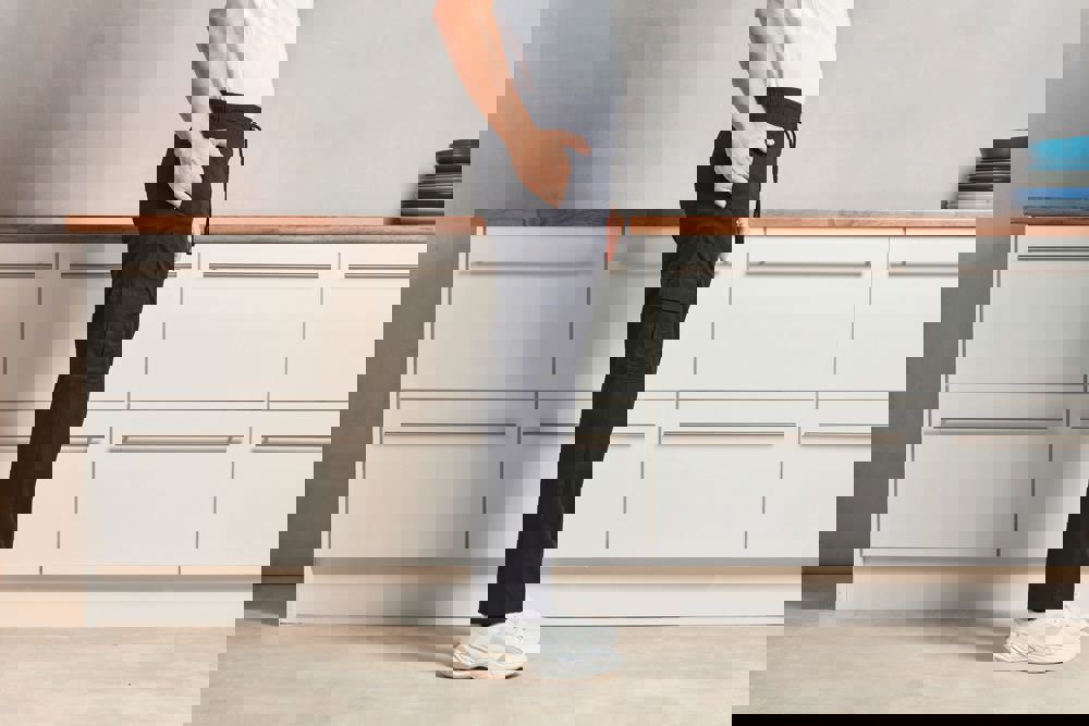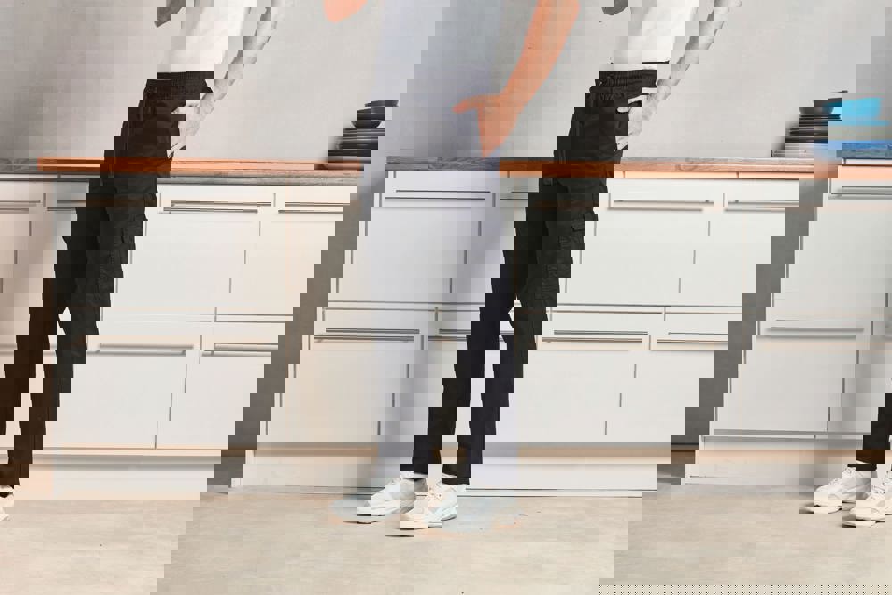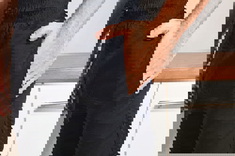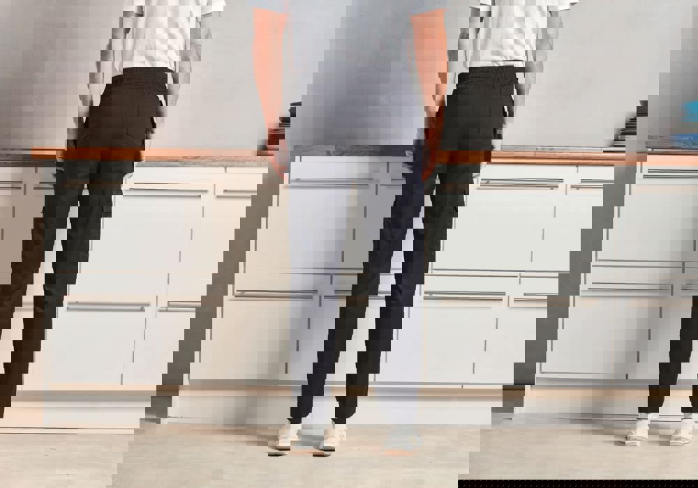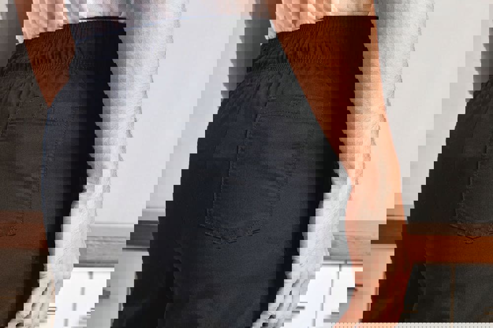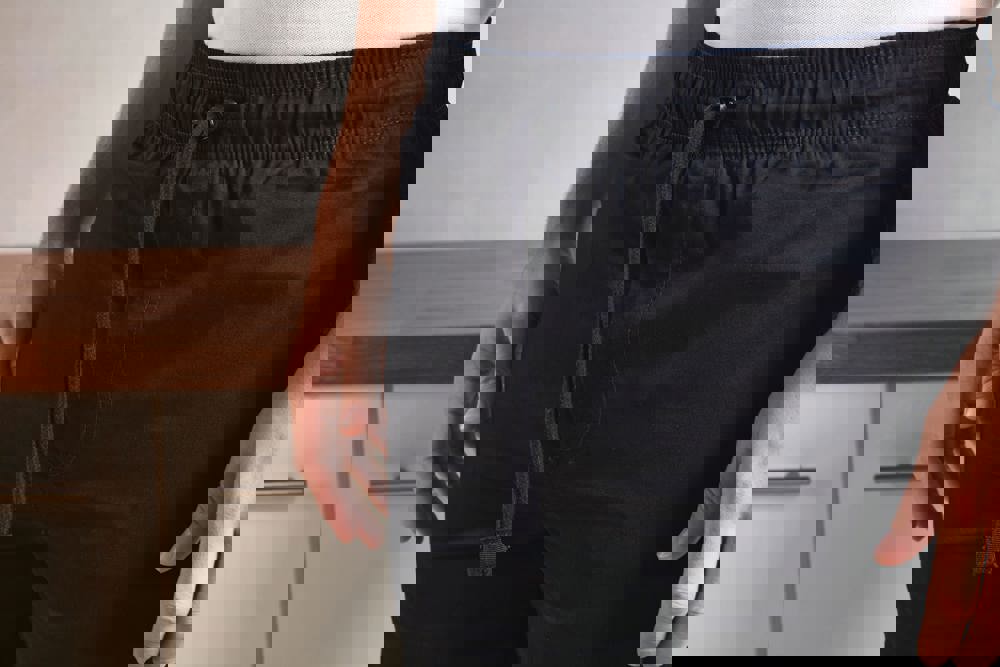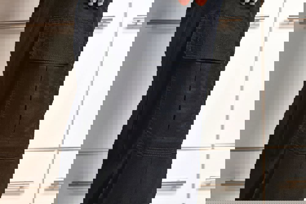 65% poliestere / 35% twill di cotone. Tasche cargo sulle gambe con chiusura a strappo. Girovita elasticizzato con coulisse. Tasca unica dietro con chiusura a strappo. Lunghezza gamba: 82 cm. Lavabili a 60°C.