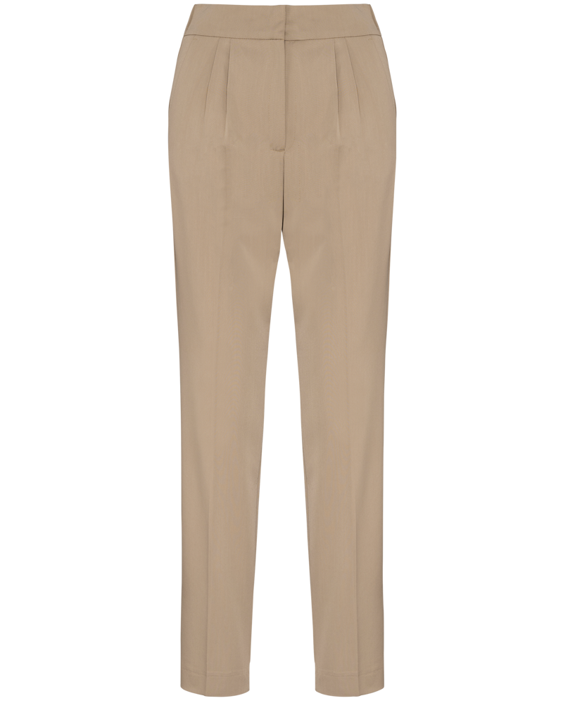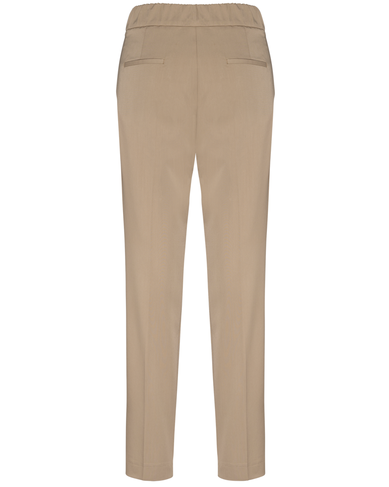 55% viscosa / 42% poliestere / 3% elastan. Taglio dritto. Tessuto twill. Due tasche all'italiana sul davanti. Due finte tasche a filetto dietro. Patta con zip in nylon, due ganci in metallo e un bottone sulla pattina. Due pieghe comfort sul davanti con una piega permanente sulla gamba. Girovita elasticizzato dietro per un maggiore comfort. Finitura all'interno del girovita nel tessuto principale con bordo a sbieco tono su tono. Nessuna etichetta con il nome della marca; solo una piccola etichetta con l'indicazione della taglia per semplificare la personalizzazione.