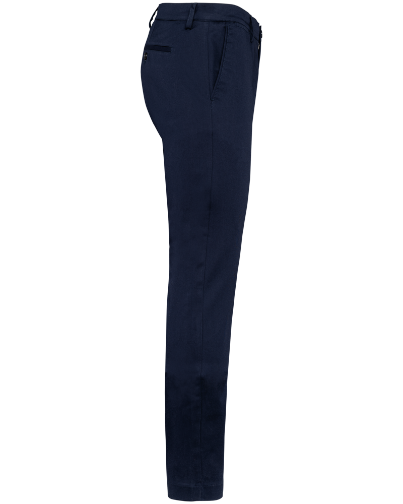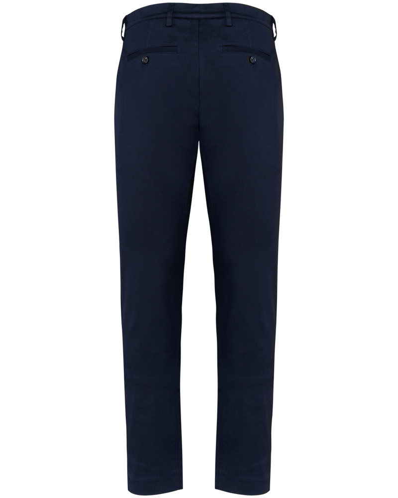 98% cotone / 2% elastan. Tessuto twill. Due tasche all'italiana sul davanti con bordino rigato di rinforzo tono su tono e cucitura a nervatura. Un taschino e una tasca portamonete sul lato destro. Due tasche a filetto posteriori con cucitura di rinforzo e bottoni tono su tono effetto marmo. Patta con zip in metallo e bottone tono su tono effetto marmo. Girovita con passanti. Finiture all'interno del girovita, patta e sacco tasca con motivo a righe sottili tono su tono in bianco sporco per tutti i colori. Nessuna etichetta con il nome della marca; solo una piccola etichetta con l'indicazione della taglia per semplificare la personalizzazione.