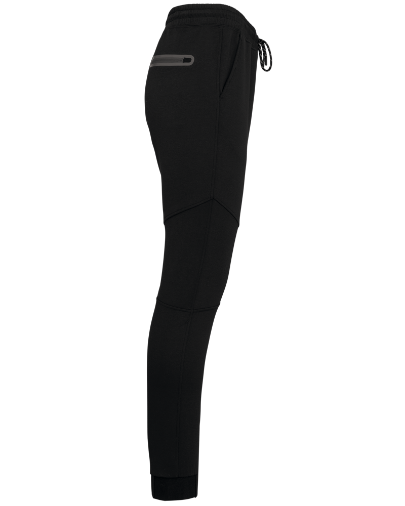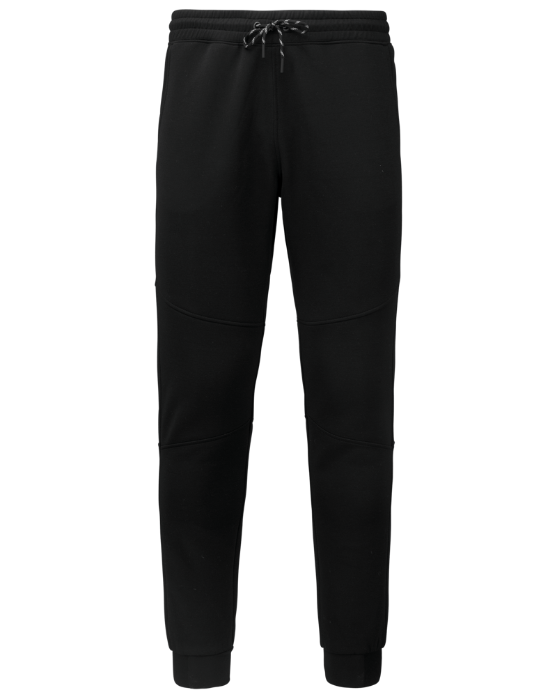 94% poliestere/ 6% elastan (79% poliestere/15% viscosa/ 6% elastan per i colori melange). Materiale ultra comodo. Girovita elastico con coulisse bicolore e finitura puntale in plastica. 2 tasche sul davanti con fodera in jersey 65% poliestere/ 35% viscosa e 1 tasca posteriore con finitura termosaldata. Taglio moderno e aderente con inserti sulle ginocchia. Fondo gamba stretto con una parte elastica a contrasto Black su tutti i colori e Dark Grey sull'erica di Ash Heather.