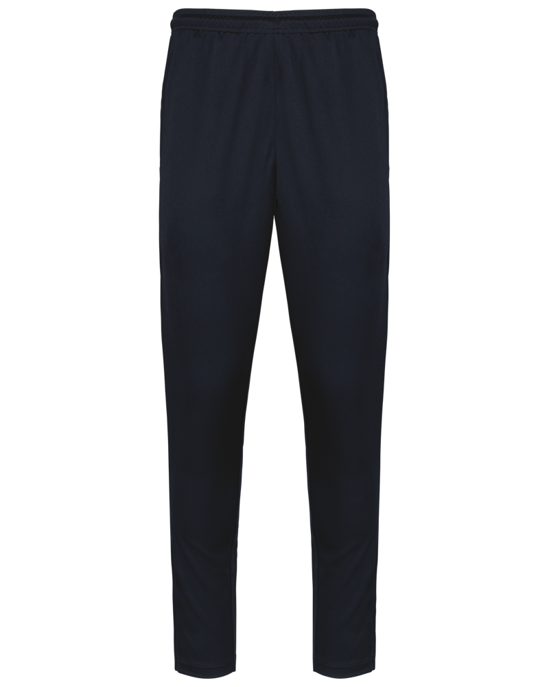 100% poliestere interlock opaco. Taglio slim. 2 tasche laterali con zip. Girovita elasticizzato con coulisse rotonda e puntale in gomma all'interno del girovita. Fondo gamba con zip con orlo a doppia impuntura. Etichetta con il nome della marca staccabile per semplificare la personalizzazione.