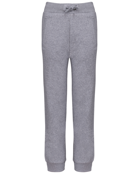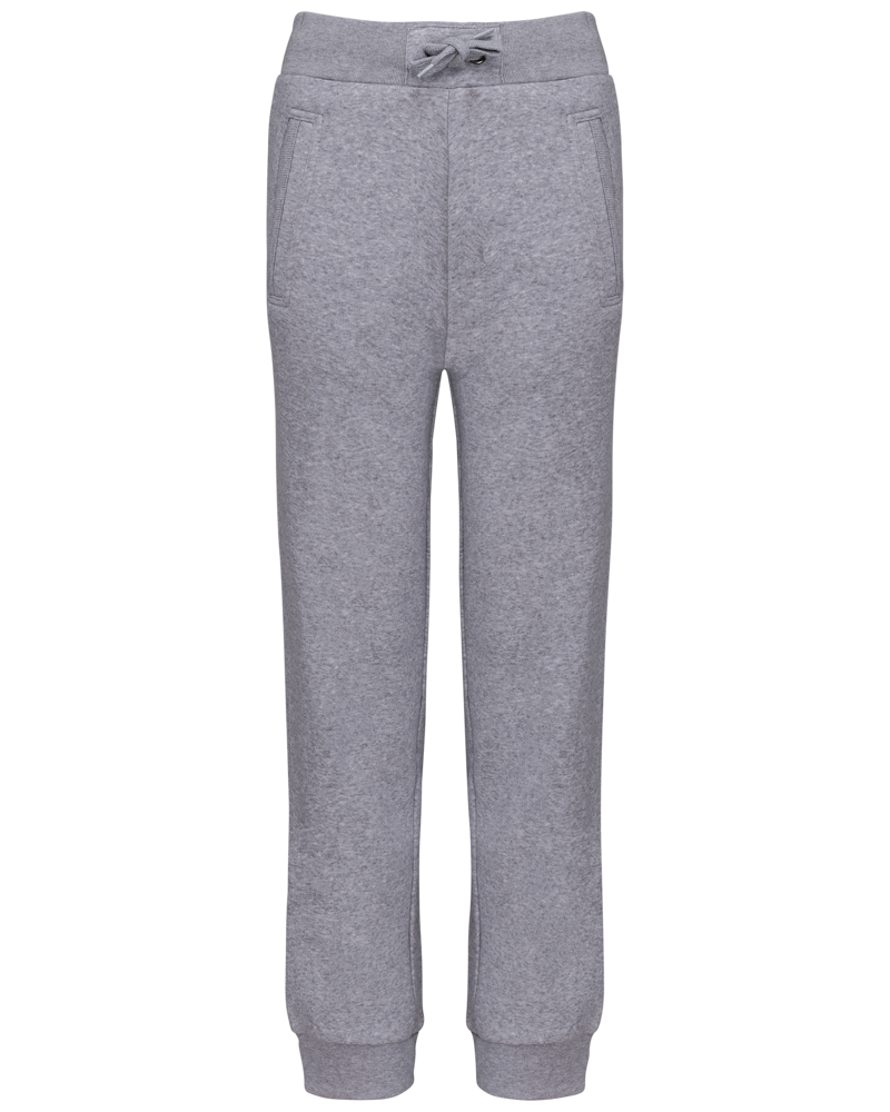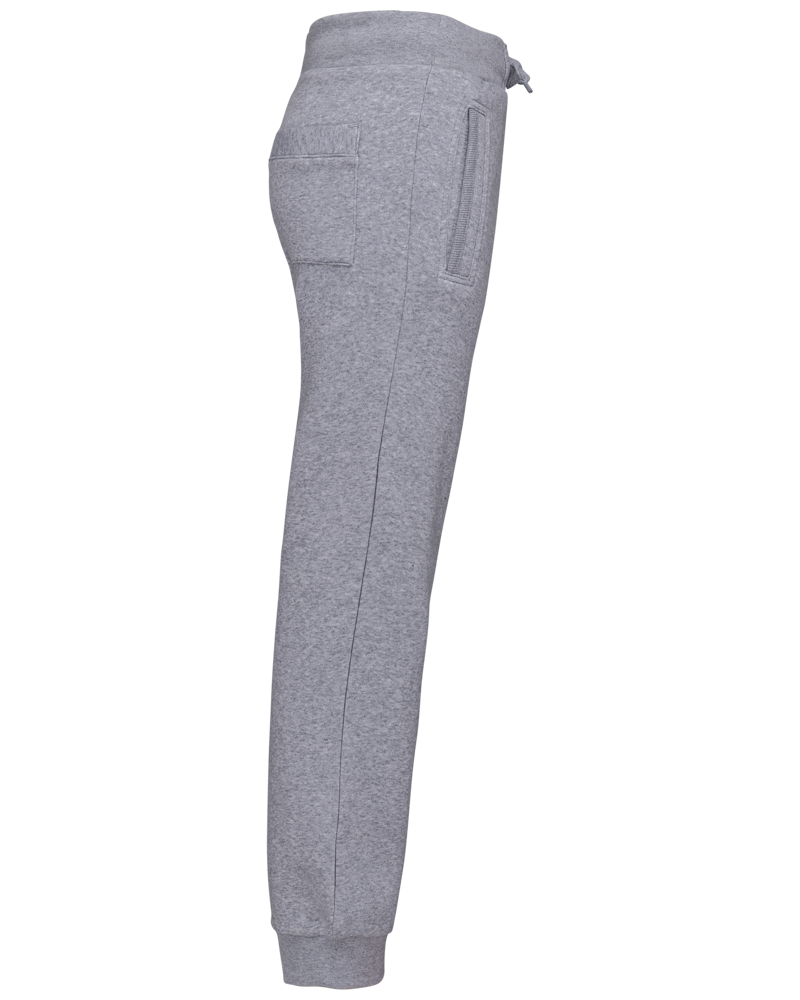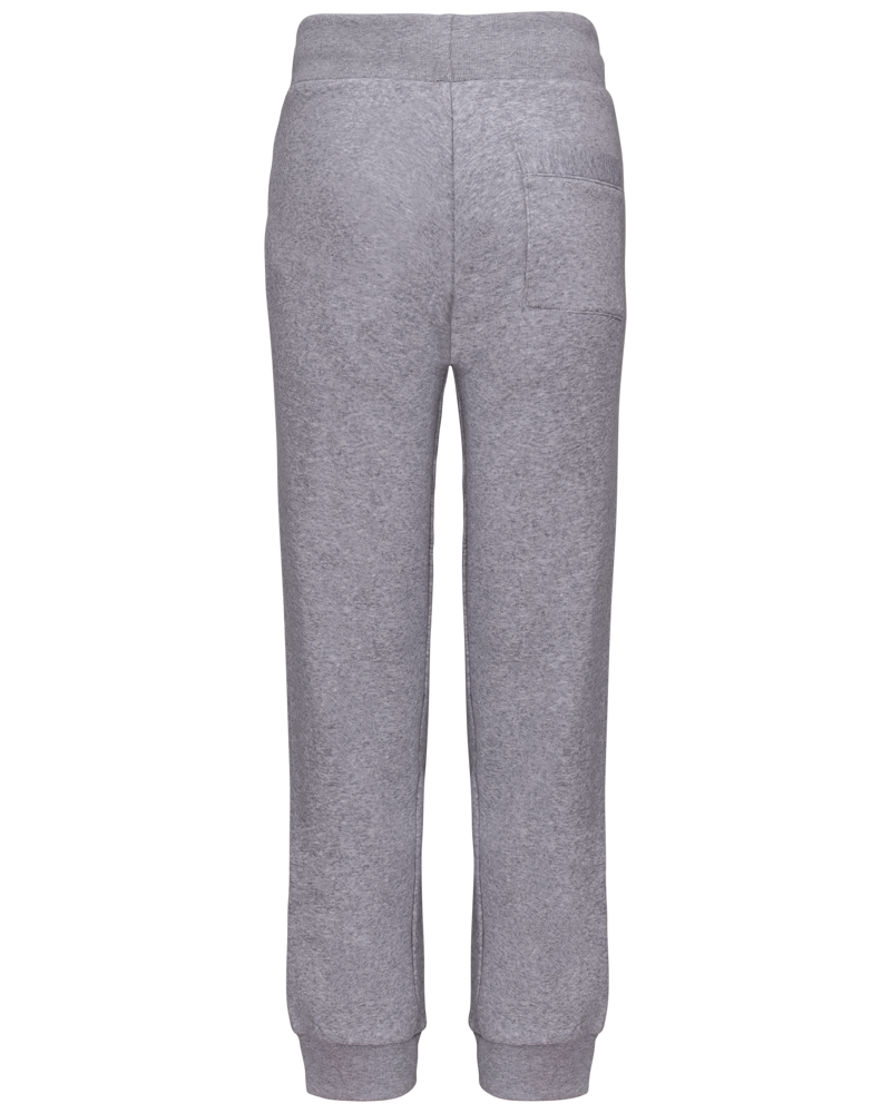80% cotone / 20% poliestere. Cotone pettinato. Felpa garzata. 2 tasche laterali e 1 tasca posteriore con patch. Elastico in vita. Fondo gamba a costine.