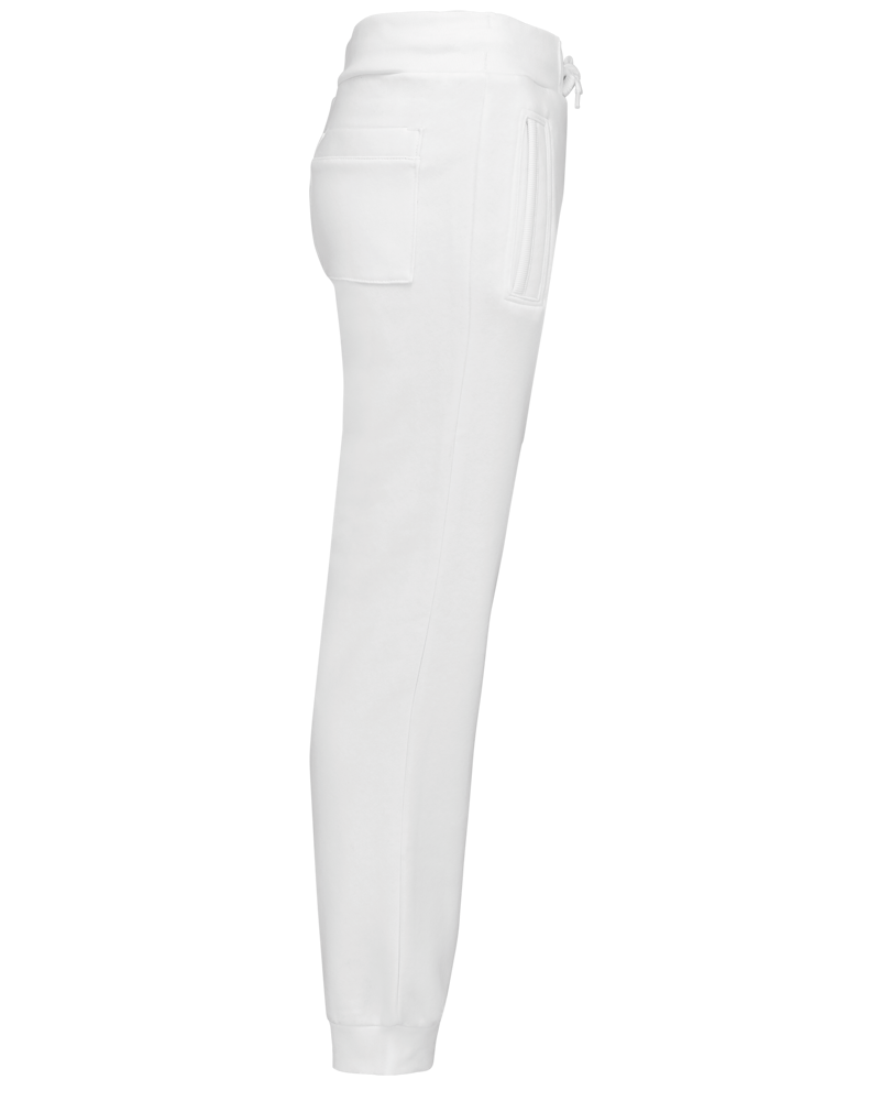 80% cotone / 20% poliestere. Cotone pettinato. Felpa garzata. 2 tasche laterali e 1 tasca posteriore con patch. Elastico in vita. Fondo gamba a costine.