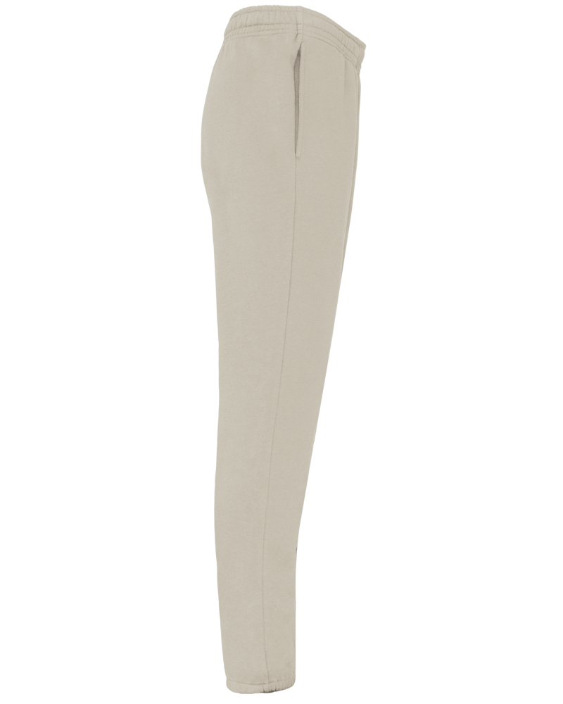 85% cotone biologico / 15% poliestere riciclato post-consumer. Tessuto felpato 3 fili LSF (Low Shrinkage Fleece). Cotone pettinato. Lavaggio agli enzimi. Taglio dritto. 2 tasche laterali. Girovita elasticizzato con coulisse piatta. Fondo gamba elasticizzato. Nessuna etichetta con il nome del marchio ; solo una piccola etichetta con l'indicazione della taglia per semplificare la personalizzazione.