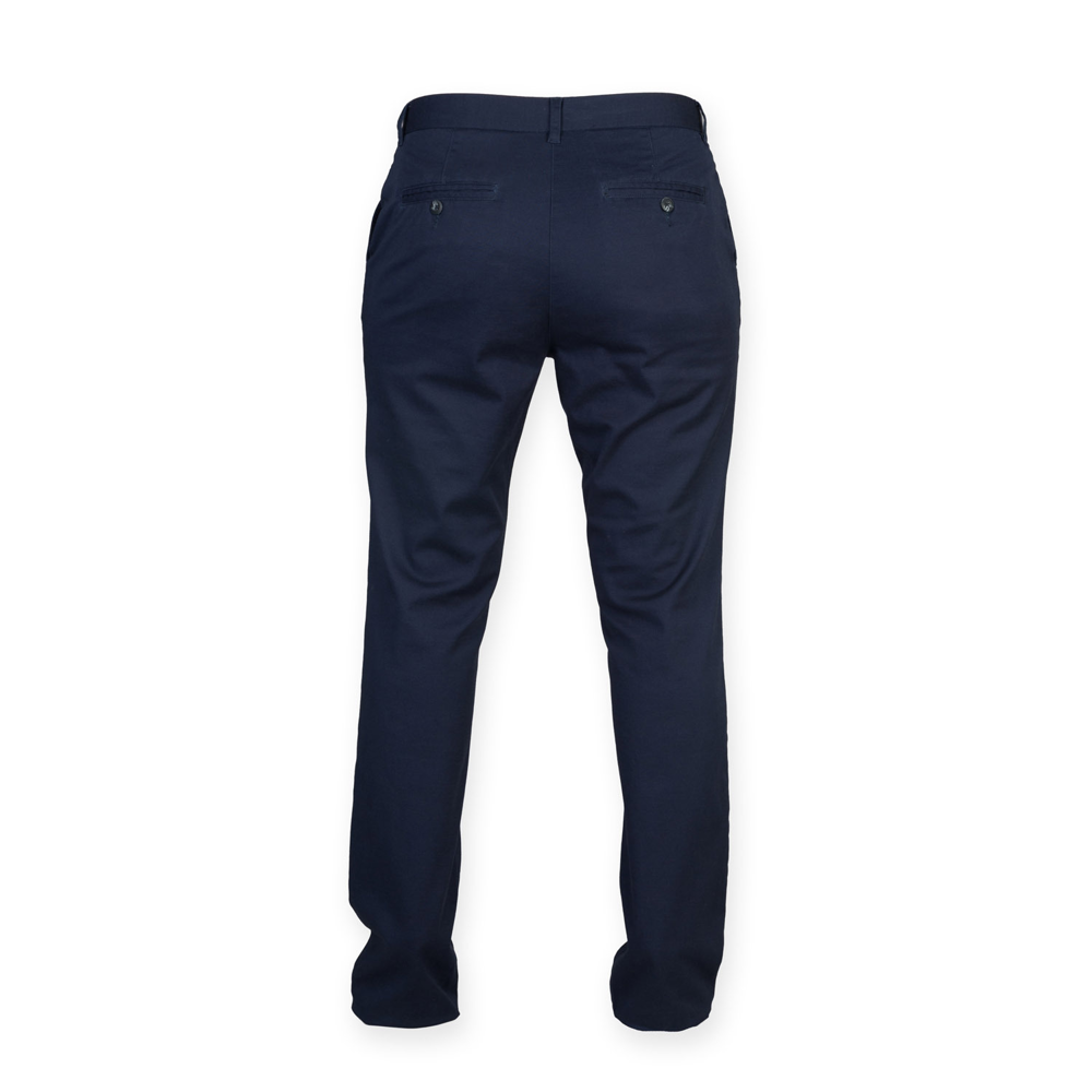 97% cotone / 3% elastan. Pantaloni Chino con tasche davanti inclinate e due tasche a filetto dietro. Passanti per cintura. Zip YKK. Orlo semplice. Nessuna etichetta per semplificare la personalizzazione.