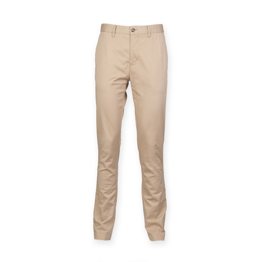 97% cotone / 3% elastan. Pantaloni Chino con tasche davanti inclinate e due tasche a filetto dietro. Passanti per cintura. Zip YKK. Orlo semplice. Nessuna etichetta per semplificare la personalizzazione.