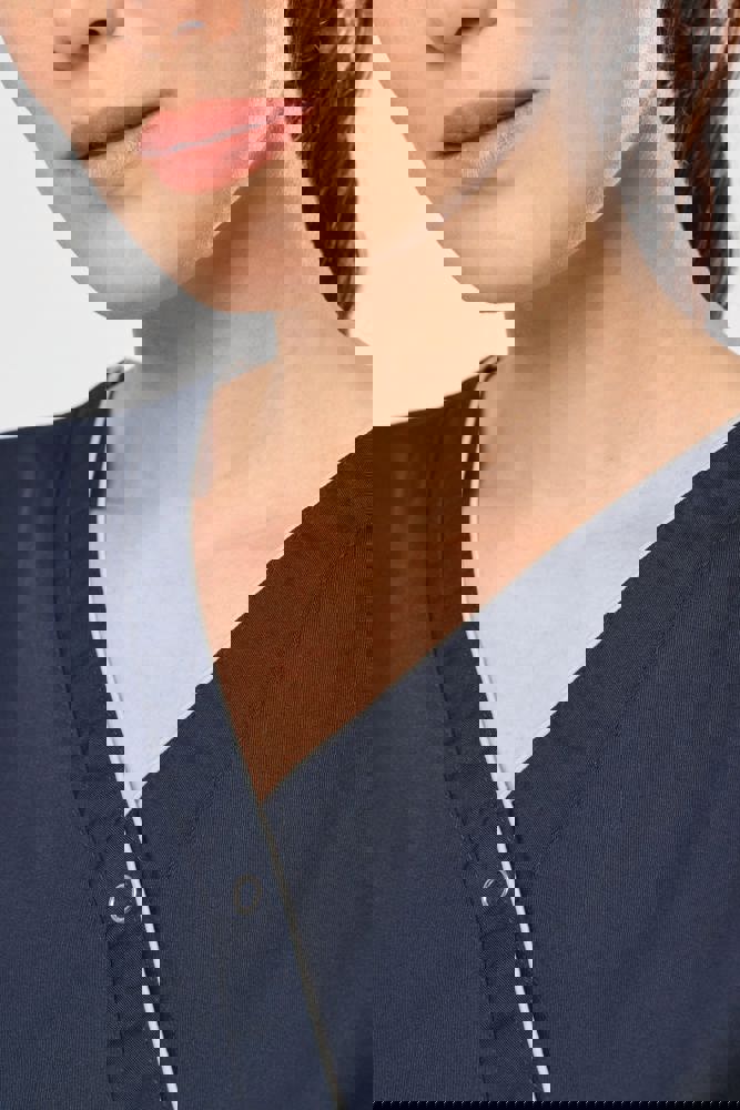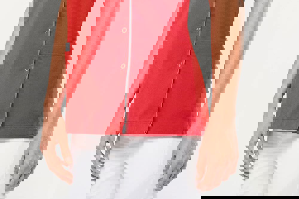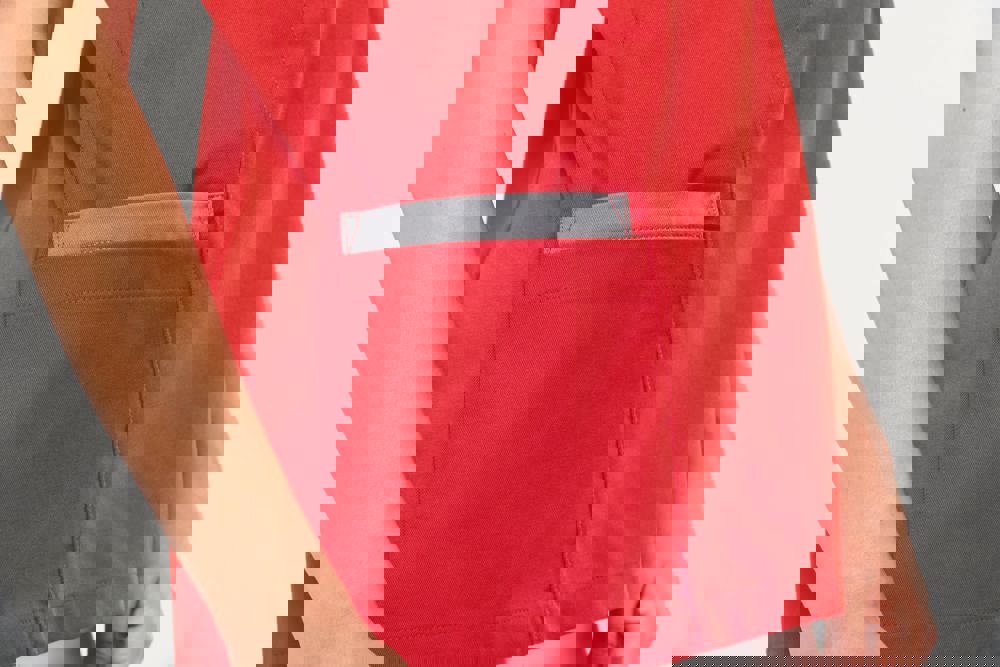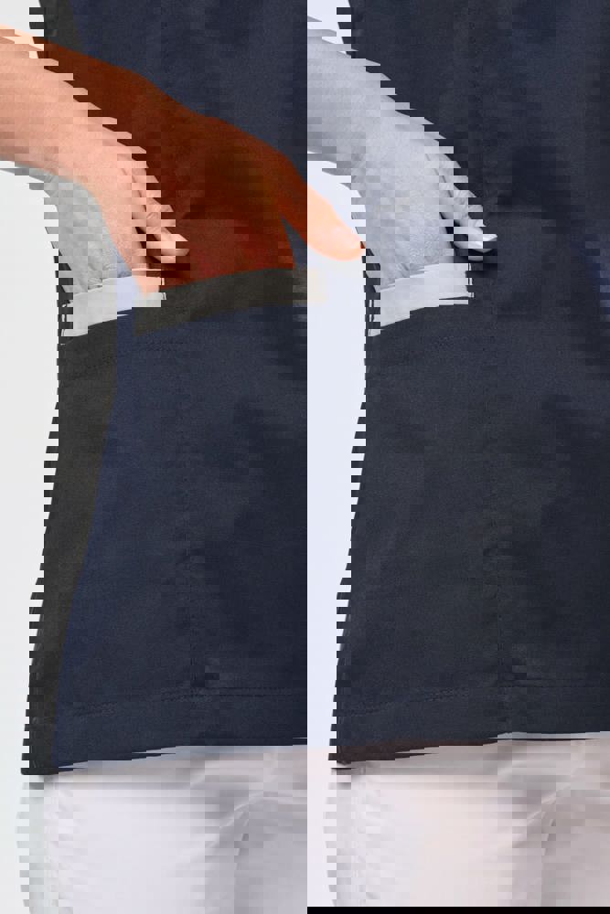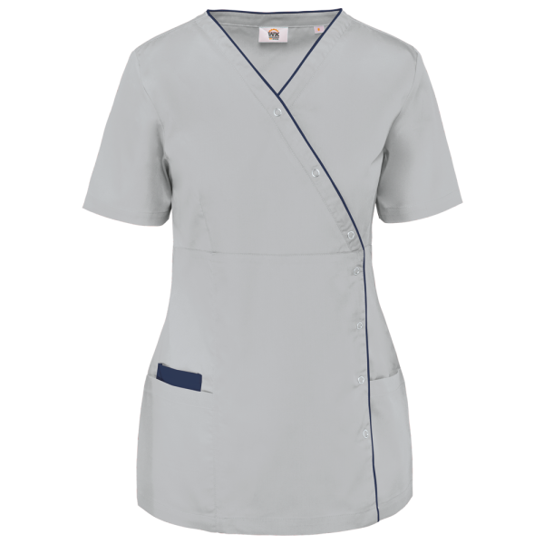 65% poliestere / 35% cotone. Tessuto twill in misto poliestere-cotone. Lavaggio a 60°C. Taglio dritto grazie a pince davanti e dietro per un taglio più femminile. Collo a V, chiusura asimmetrica con bottoni a pressione. 2 tasche davanti di cui una (a destra) a doppio scomparto (tasca interna con bordo a contrasto). Dettaglio a contrasto sul collo e lungo la pattina di chiusura. Etichetta con il nome all'interno del capo. Etichetta con il nome del marchio staccabile.