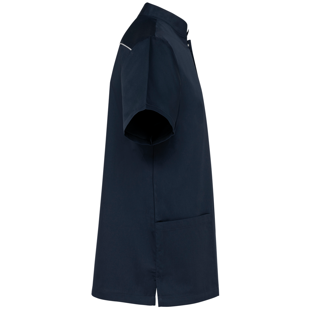 65% poliestere / 35% cotone. Twill in misto poliestere-cotone. Lavaggio a 60°C. Taglio dritto. Collo alla coreana. Chiusura frontale con automatici. 1 tasca sul petto applicata lato cuore con scomparto porta penna. 2 ampie tasche applicate davanti di cui una (a sinistra) a doppio scomparto (tasca interna con bordo a contrasto). Dettaglio a contrasto sulla pattina di chiusura e negli inserti sulla schiena. Etichetta con il nome all'interno del capo. 2 spacchi laterali. Etichetta con il nome del marchio staccabile.