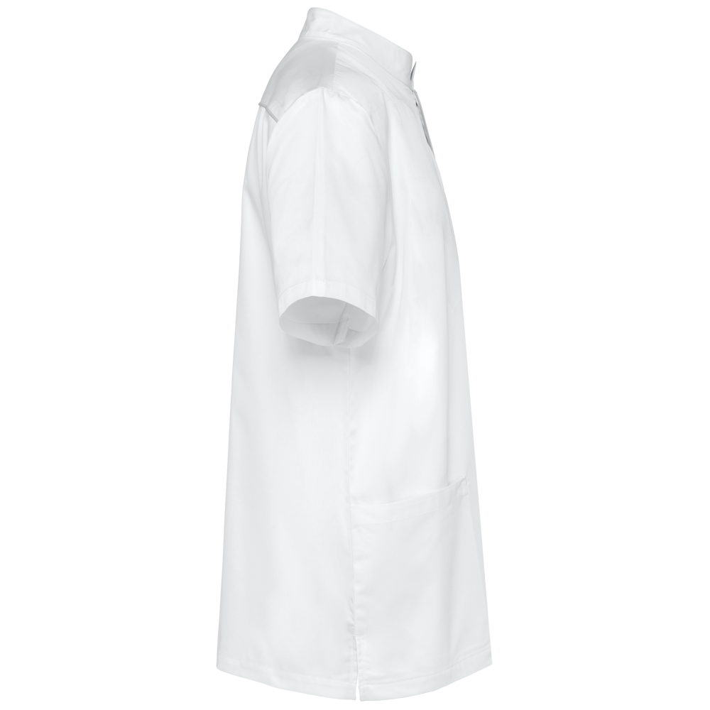 65% poliestere / 35% cotone. Twill in misto poliestere-cotone. Lavaggio a 60°C. Taglio dritto. Collo alla coreana. Chiusura frontale con automatici. 1 tasca sul petto applicata lato cuore con scomparto porta penna. 2 ampie tasche applicate davanti di cui una (a sinistra) a doppio scomparto (tasca interna con bordo a contrasto). Dettaglio a contrasto sulla pattina di chiusura e negli inserti sulla schiena. Etichetta con il nome all'interno del capo. 2 spacchi laterali. Etichetta con il nome del marchio staccabile.