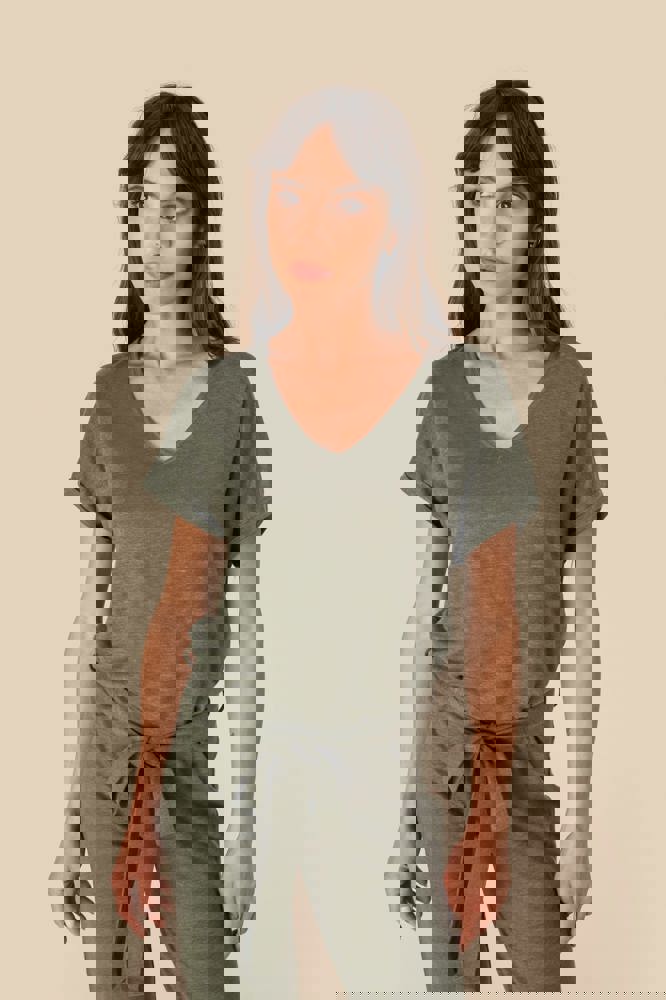 100% lino. Maglia. Taglio comfort con spalle cascanti. Scollo a V davanti e dietro. Cucitura a nervatura sullo scollo con sbieco nel tessuto principale. Maniche con risvolto mantenute con punti di cucitura. Girovita piatto in materiale principale con passanti laterali. Orlo a impuntura doppia a fondo capo.