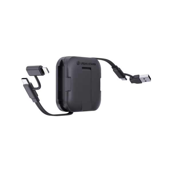 The ultimate all-in-one charging solution. San Jose is a 100W phone stand with an integrated retractable charging cable that delivers super-fast power and convenience. With its magnetic phone stand and kickstand, San Jose keeps your phone secure and propped up at the perfect angle for hands-free use — whether you're watching videos, video calling, or using CarPlay.The retractable RTPE cable extends up to 100cm and offers super-fast charging, supporting up to 100W power delivery with the USB-C to USB-C cable. It also comes with USB-A to USB-C and USB-A to iOS connectors, making it versatile enough to charge a wide range of devices. Plus, it supports data transfer for seamless file syncing while you charge. San Jose is made with RCS (Recycled Claim Standard) certified RABS & RTPE materials. Total recycled content 59% based on item weight. Urban Vitamin items are made without PVC and packed in plastic-reduced packaging.