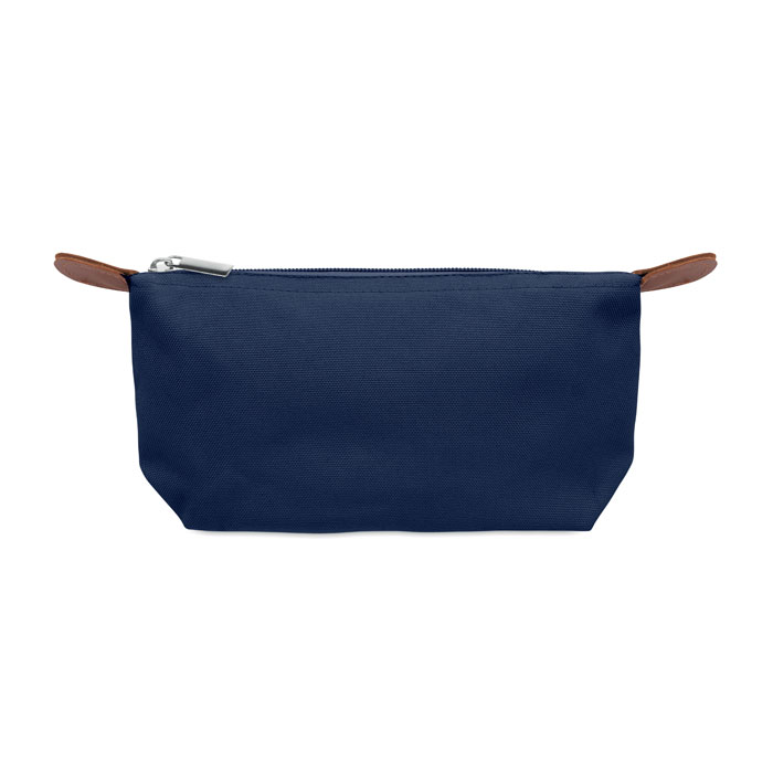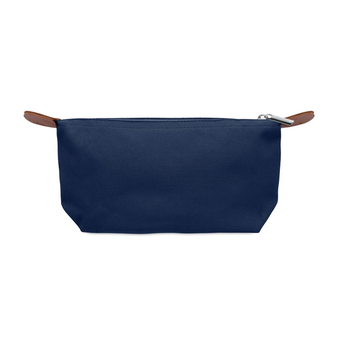Cosmetic bag made of 600D RPET polyester with top zip closure and brown PU detail.